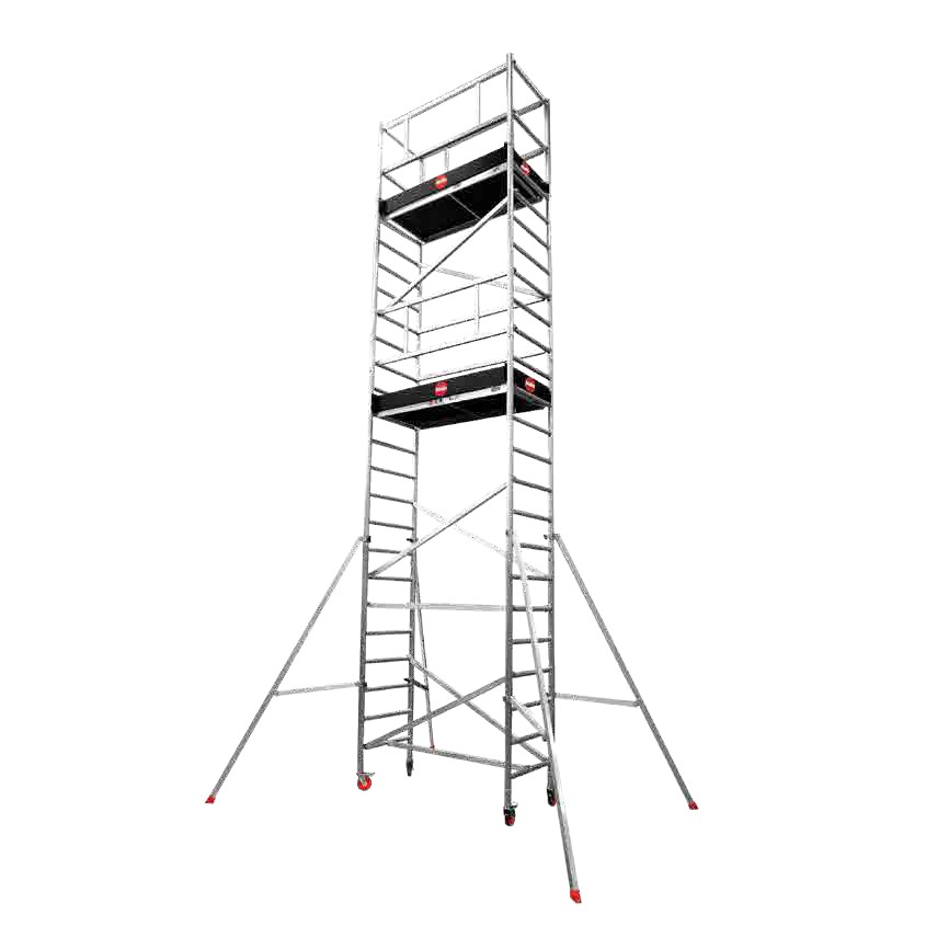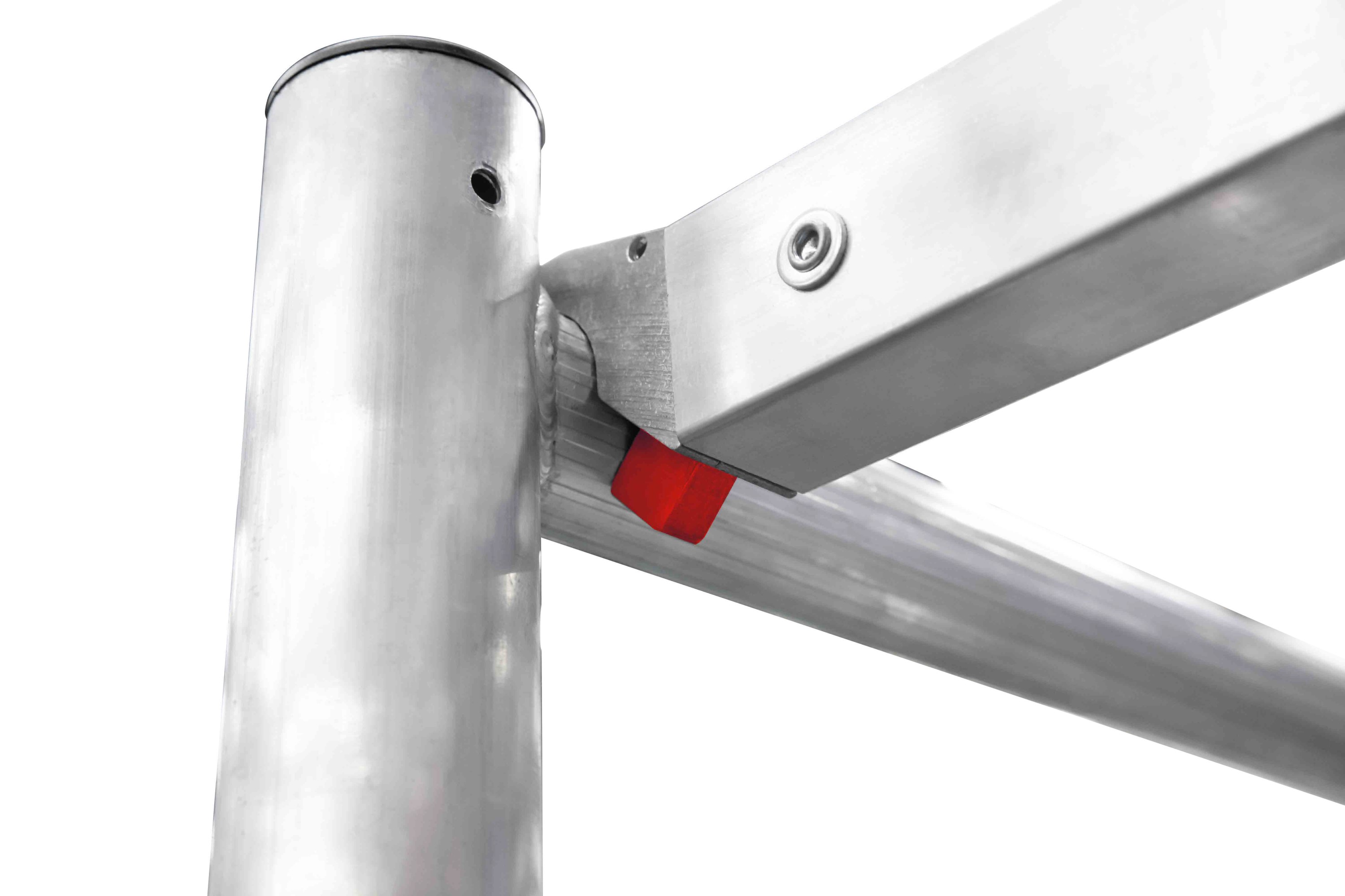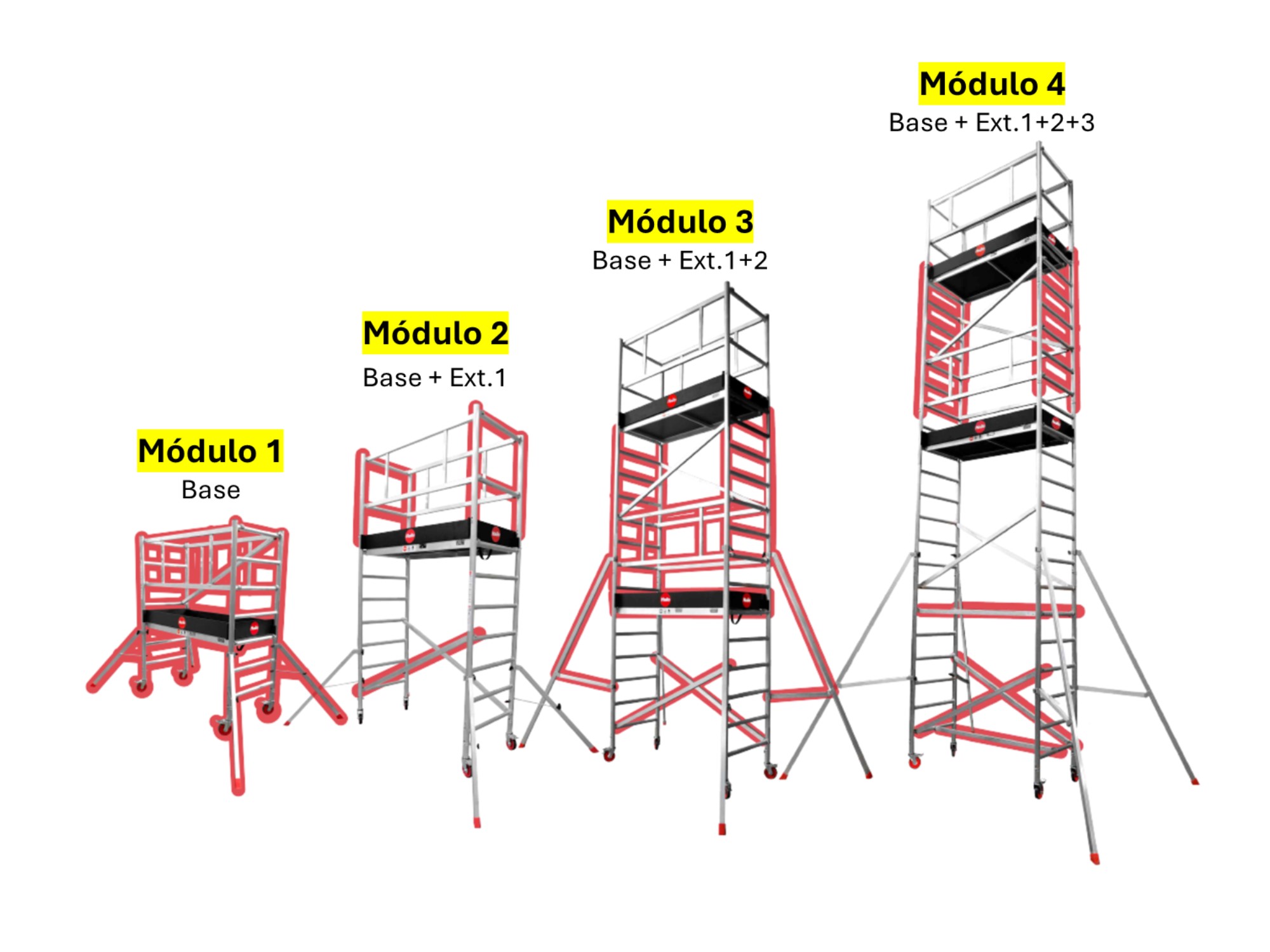 El sistema está compuesto por 4 módulos desmontables, que permiten configurar cuatro alturas de trabajo diferentes, alcanzando una altura máxima de trabajo de 7,40 m. El montaje es rápido y sencillo gracias al sistema de bloqueo automático, reduciendo tiempos de instalación y minimizando errores durante el ensamblaje.