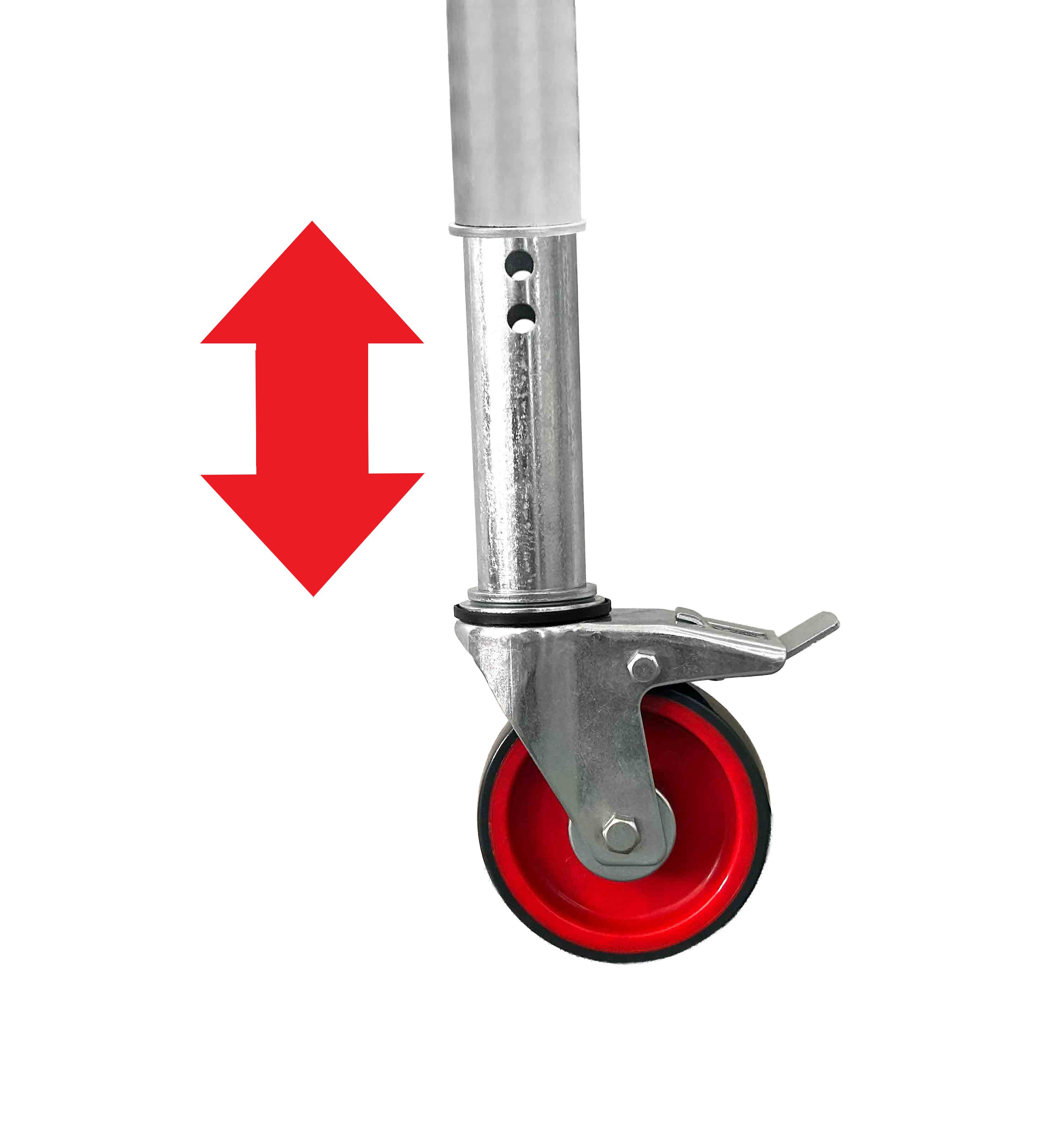 La torre se desplaza mediante 4 ruedas de Ø125 mm con frenos de seguridad, incorporando ajuste de nivel mediante 6 orificios espaciados cada 18 mm. El conjunto cumple la norma EN 1004-1:2020 para uso profesional y se alinea con las UNE-EN 1004-1:2021 y UNE-EN 1004-2:2022 como marco normativo vigente para torres móviles de trabajo.