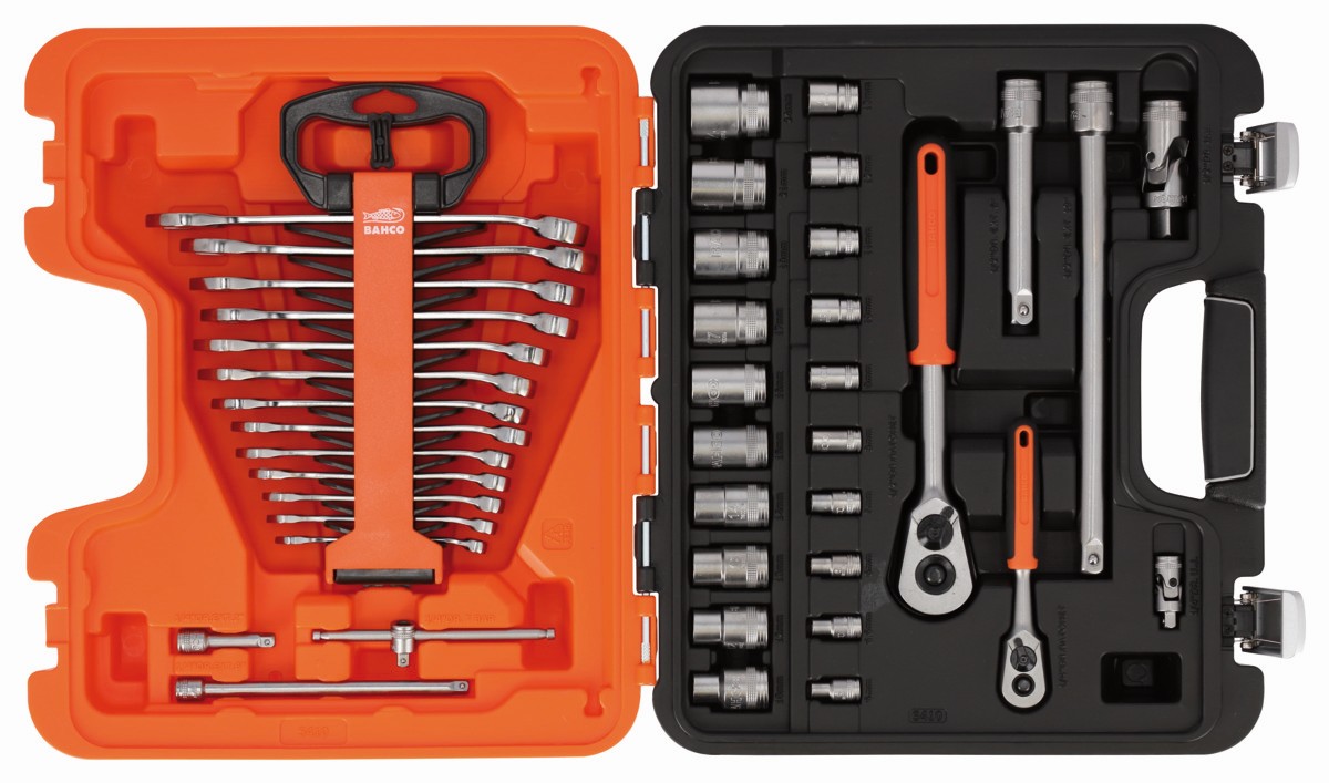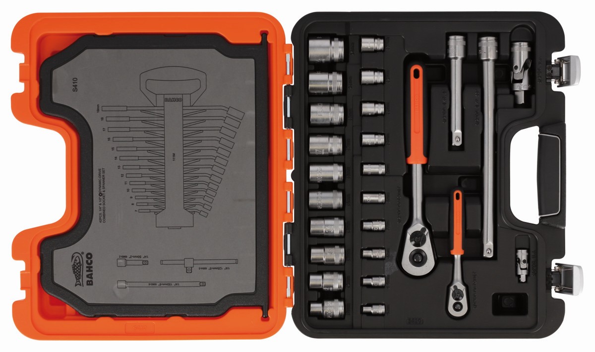 Juego de vasos de 1/4" y 1/2", con perfil hexagonal métrico y juego de llaves combinadas, 42 piezas | S410 de BAHCO