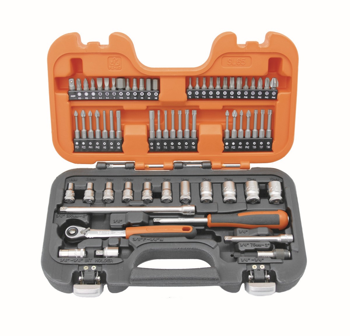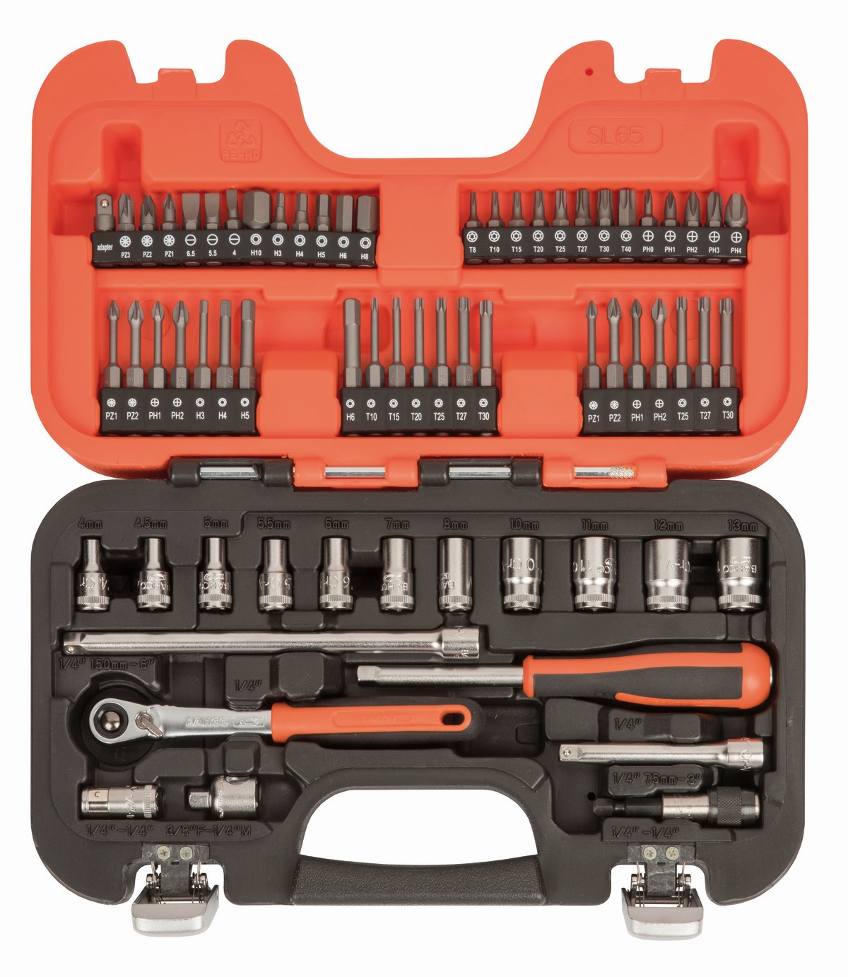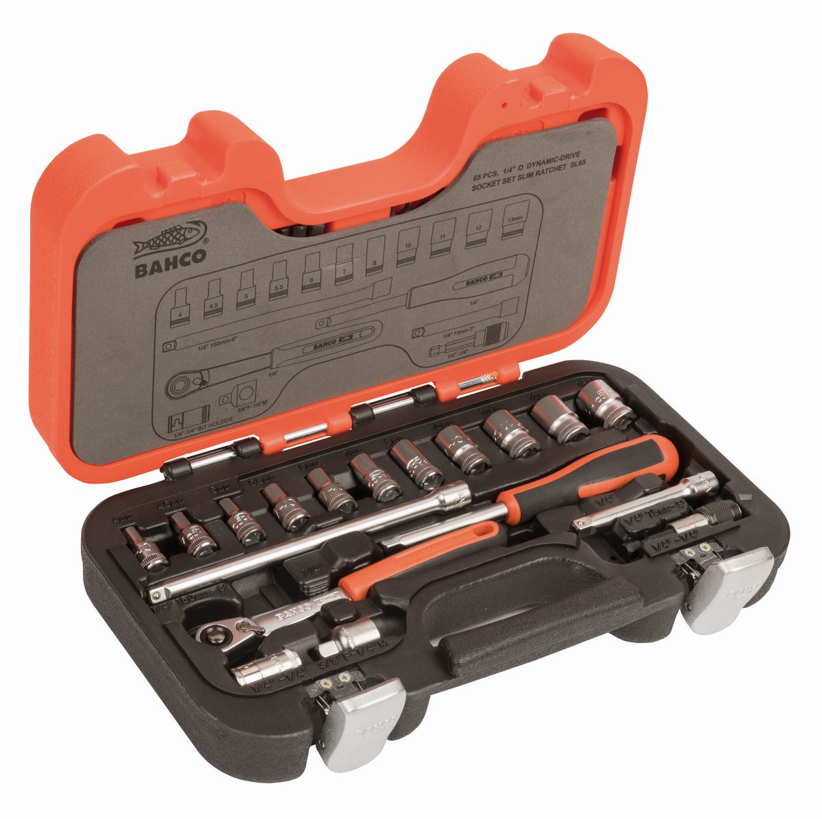 Juego de vasos con cuadradillo de 1/4", con perfil hexagonal métrico y carraca de cabeza delgada (65 piezas) | SL65 de BAHCO