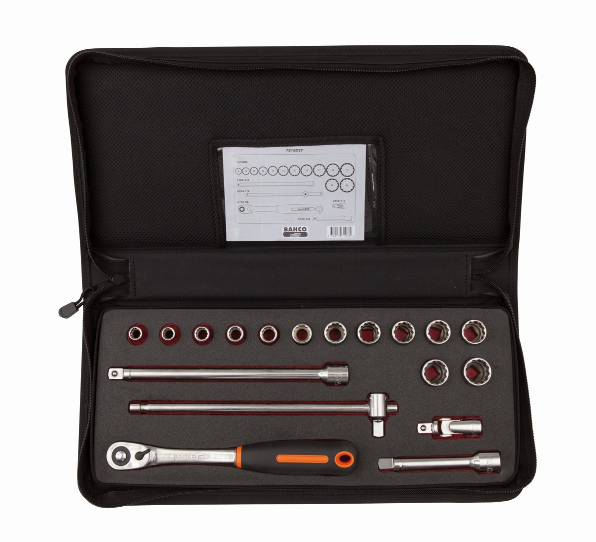 Juego de vasos con cuadrado de 1/2" con perfil bi-hexagonal métrico y maletín de poliéster para mango corredizo en T | 7818DST de BAHCO