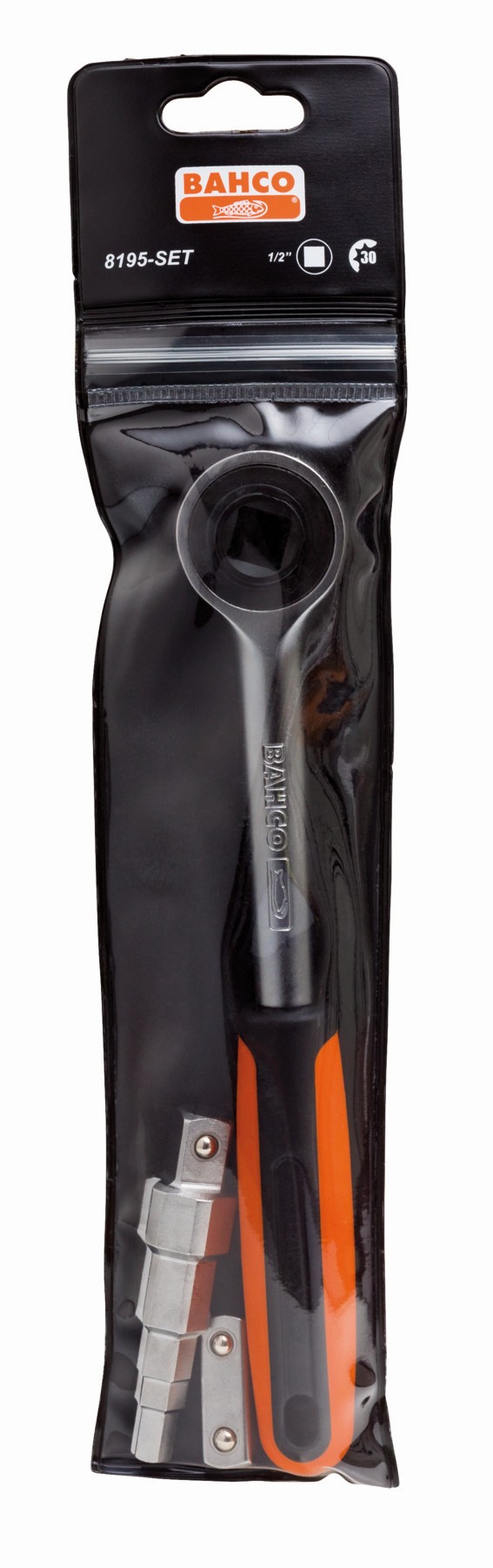 El juego incluye una carraca 8195-R, un cuadrado 8195-SQ y una llave escalonada 8195-KEY dentro de un práctico estuche de plástico.