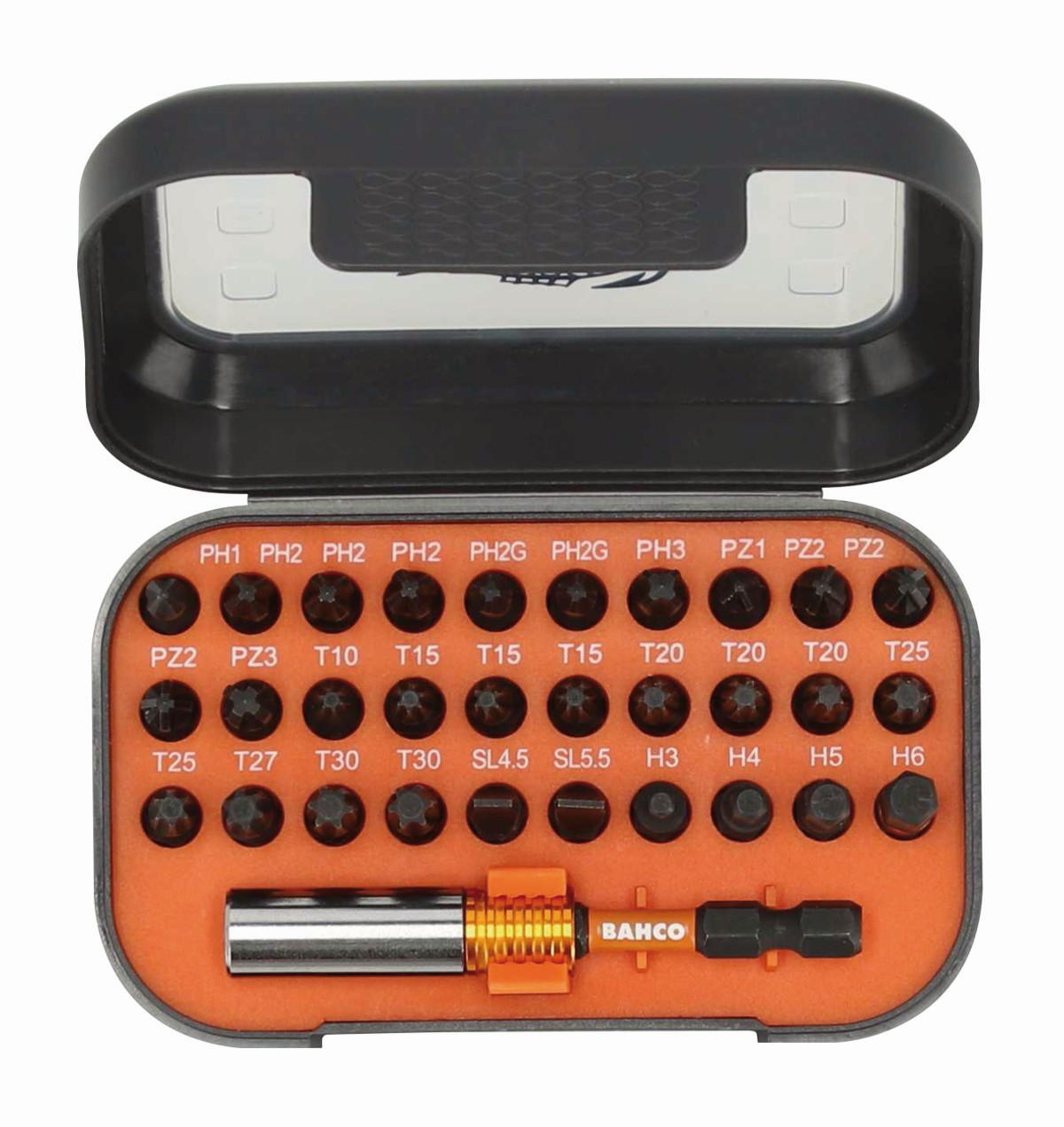 - Puntas de 25 mm: SL4,5, SL5,5, PH1, PH2x3, PH3, PH2Gx2, PZ1, PZ2x3, PZ3, T10, T15x3, T20x3, T25x2, T27, T30x2, HEX3, HEX4, HEX5, HEX6
