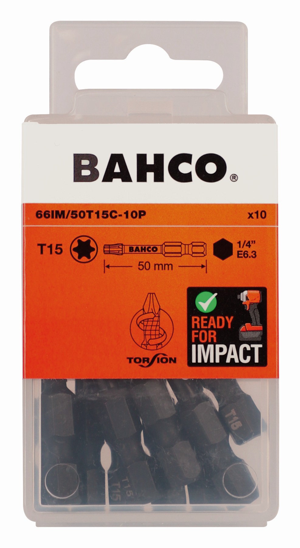 Referencia: 66IM/50T20C-10P Variante: 66IM/50T20C-10P, Número de piezas: 10, Medida punta TORX: T20, Diámetro de la estrella, mm: 3.86 mm, Longitud: 50 m