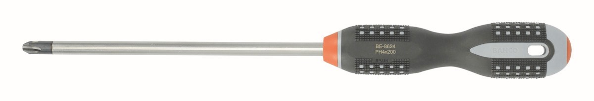 Referencia: BE-8624 Variante: BE-8624, Diámetro de la hoja: 9 mm, Cabeza del tornillo phillips: PH 4, Longitud de la varilla del destornillador, mm: 200 mm, Longitud del mango del destornillador, mm: 161 mm, Anchura del mango del destornillador, mm: 36 mm, Longitud total del destornillador, mm: 361 mm