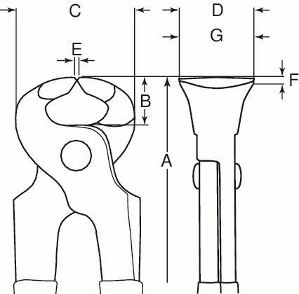 Referencia: 541 D-150 Variante: 541 D-150, Longitud, mm A: 150 mm, Longitud de la cabeza: 16 mm, Anchura de cabeza mm: 45 mm, Grosor de la cabeza mm: 20,5 mm, Anchura de la mordaza: 1,5 mm, Anchura de la punta mm: 7.0 mm, Longitud del cabezal de corte mm: 20,5 mm, Capacidad de corte, Fe_mm: 2.0 mm
