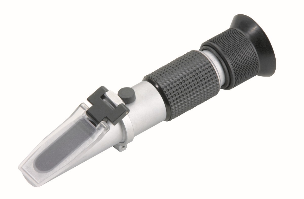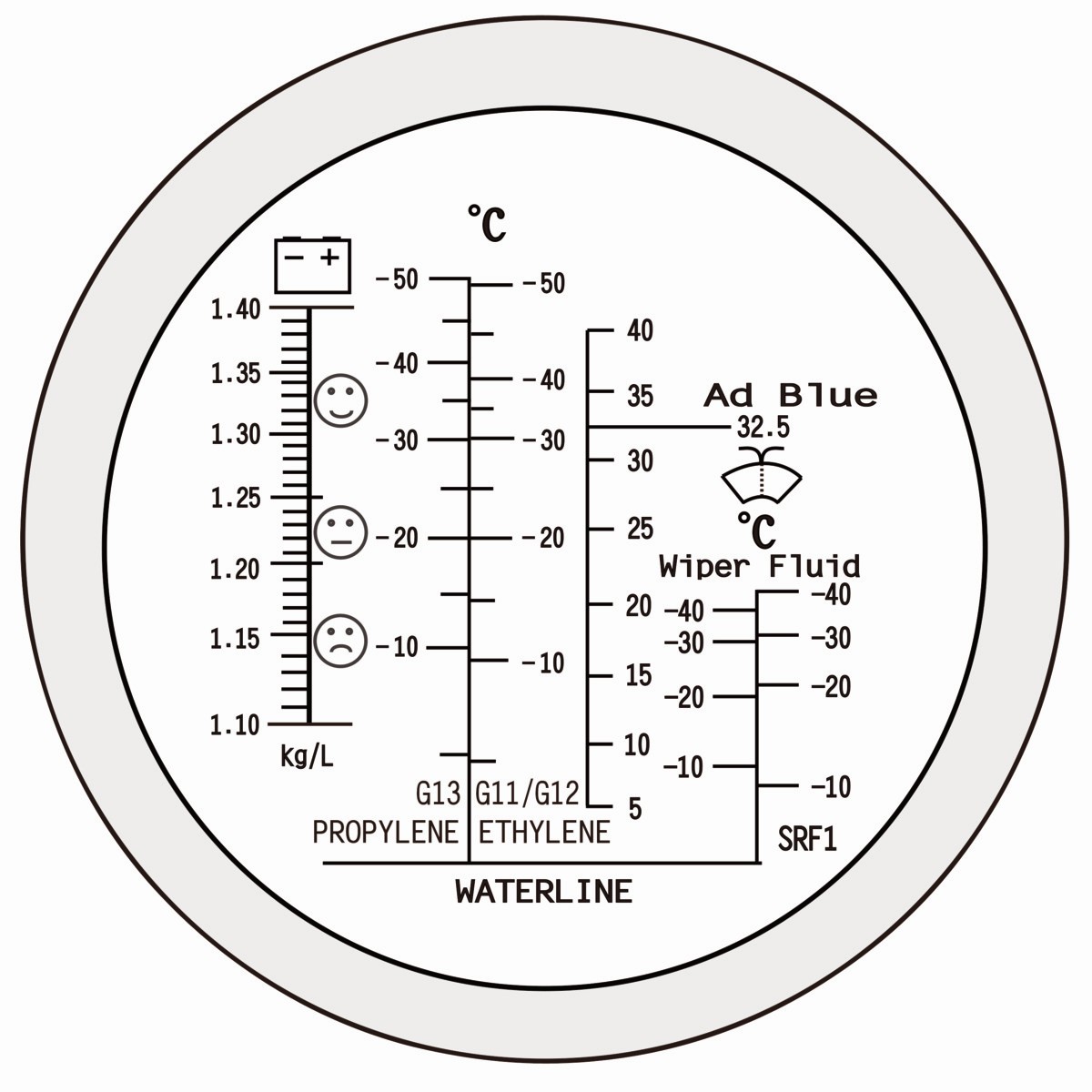 Refractómetro que mide el umbral de congelación del etilenglicol o propilenglicol en un sistema de refrigeración o del líquido de limpieza, así como la densidad del electrólito en la batería y la concentración de urea en el AdBlue