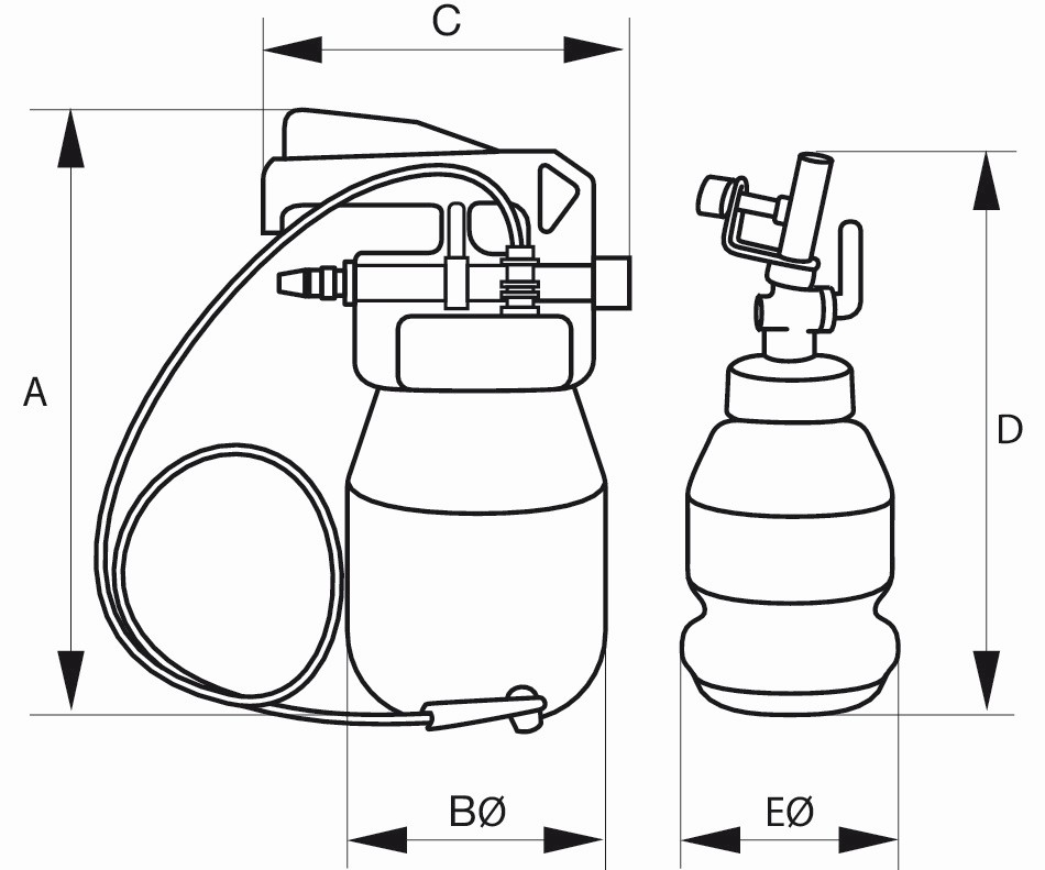 Referencia: BBR350 Variante: BBR350, Longitud, mm E: 111 mm, Longitud, mm D: 275 mm, Longitud, mm A: 301 mm, Longitud, mm B: 131 mm, Longitud, mm C: 185 mm, Longitud de la manguera: 2000 mm, Dimensiones: 300 x 125 x 125 mm, Entrada de aire, pulg: 1/4" in