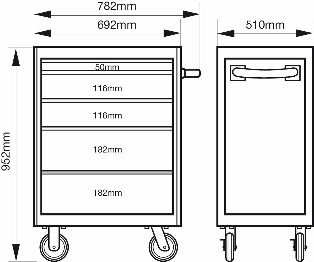 Referencia: 1472K5BLACK Variante: 1472K5BLACK, Longitud del cajón, mm: 543 mm, Anchura del cajón, mm: 445 mm, Capacidad de carga del carro, kg: 600 kg, Capacidad de carga de cajón, kg: 30 kg, Altura de la rueda, mm: 125 mm, Anchura de la rueda, mm: 30 mm, Color RAL: 9005, Dimensión del carro: 952 x 510 x 782 mm, Número de cajones: 5