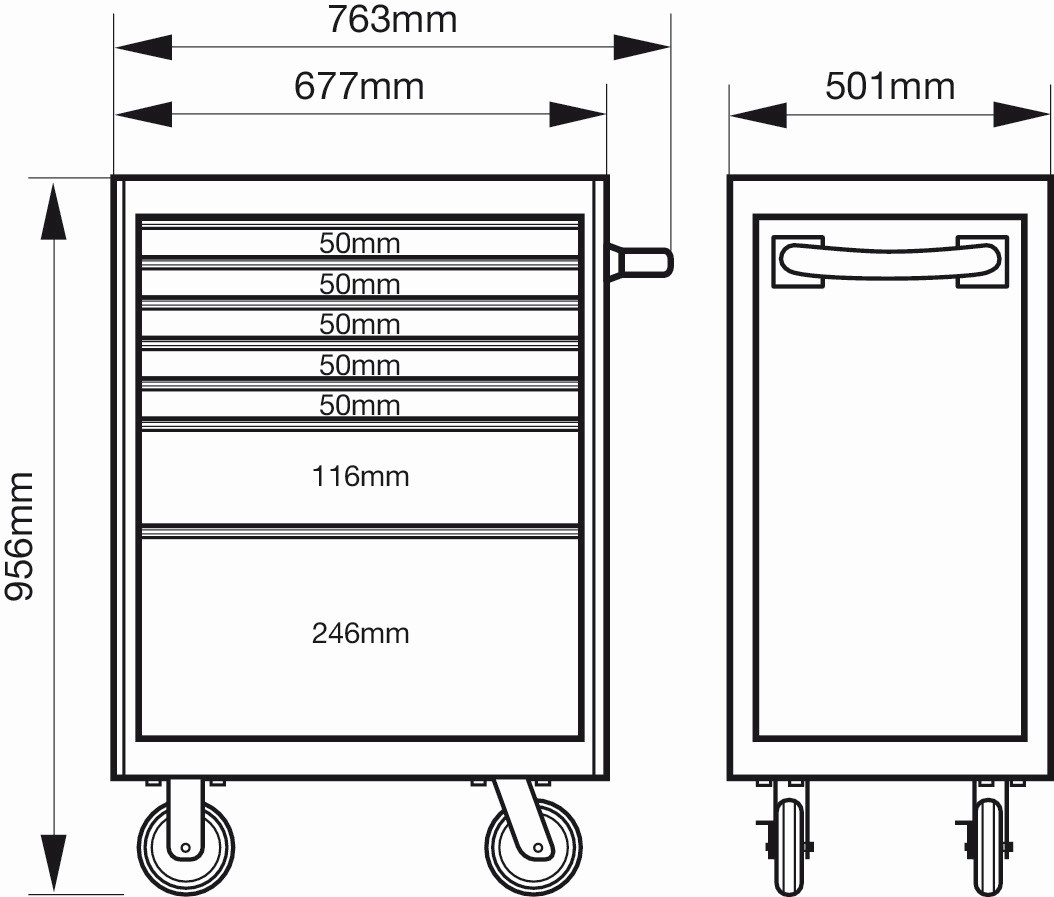 Referencia: 1475K7BLACK Variante: 1475K7BLACK, Longitud del cajón, mm: 543 mm, Anchura del cajón, mm: 445 mm, Color RAL: 9005, Capacidad de carga del carro, kg: 600 kg, Capacidad de carga de cajón, kg: 30 kg, Altura de la rueda, mm: 125 mm, Anchura de la rueda, mm: 30 mm, Dimensión del carro: 956 x 501 x 763 mm, Número de cajones: 7