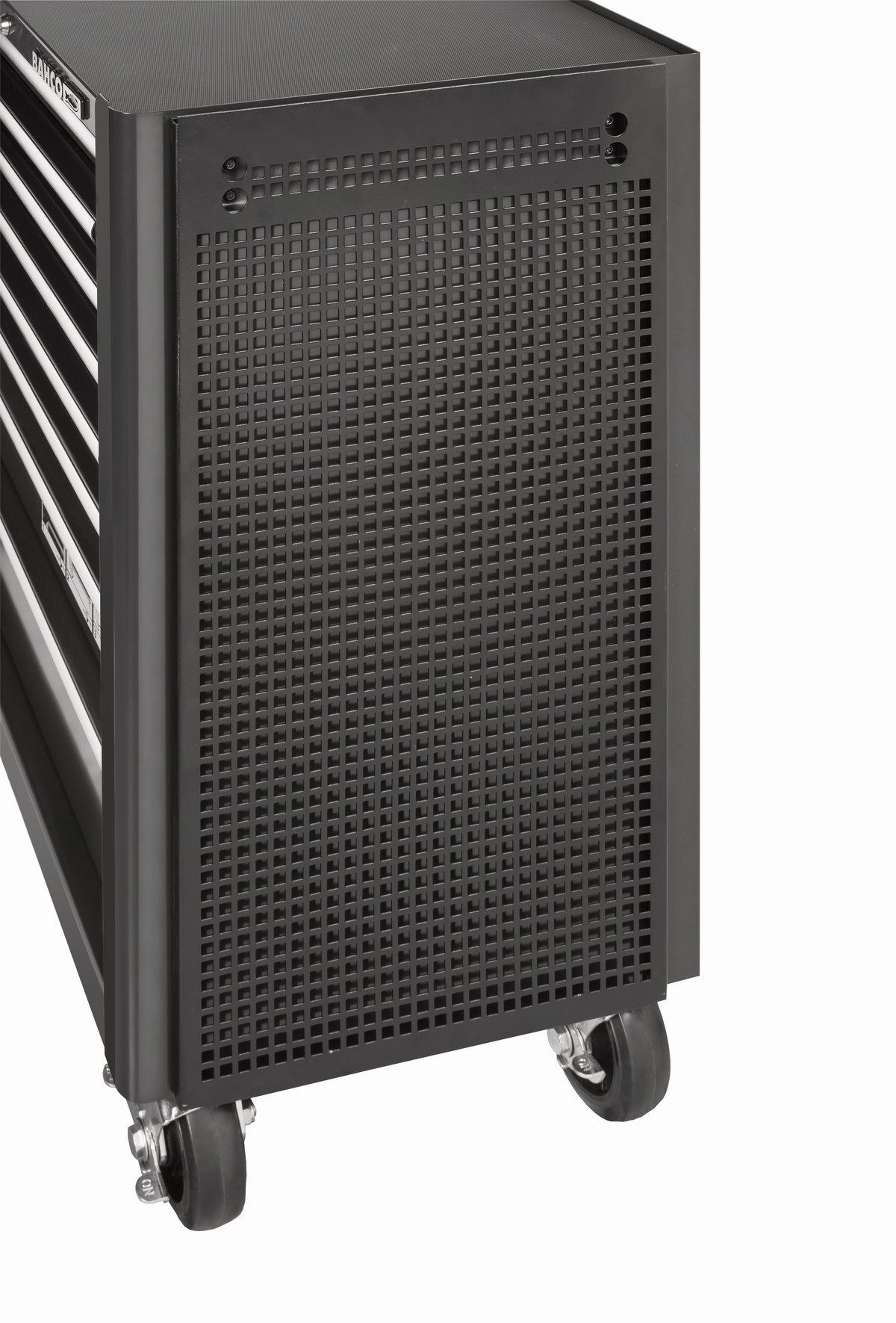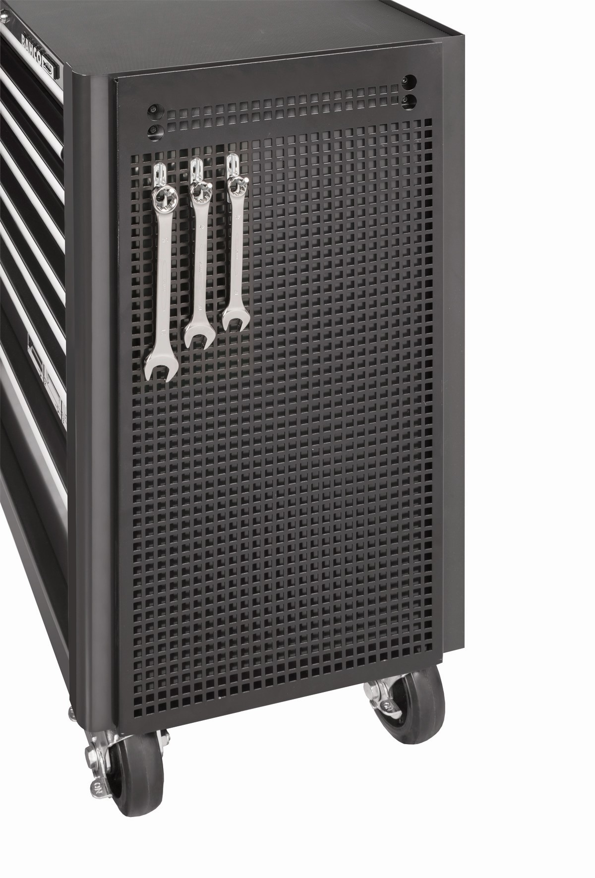 Panel de herramientas lateral con ranuras para ganchos.