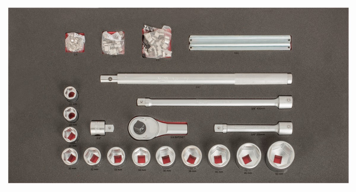 Bandeja de foam para carro de 40" con clips de metal para vasos de 1/4", 3/8" y 1/2" y juego de vasos de 3/4" (104 piezas) | FF1B11LM de BAHCO
