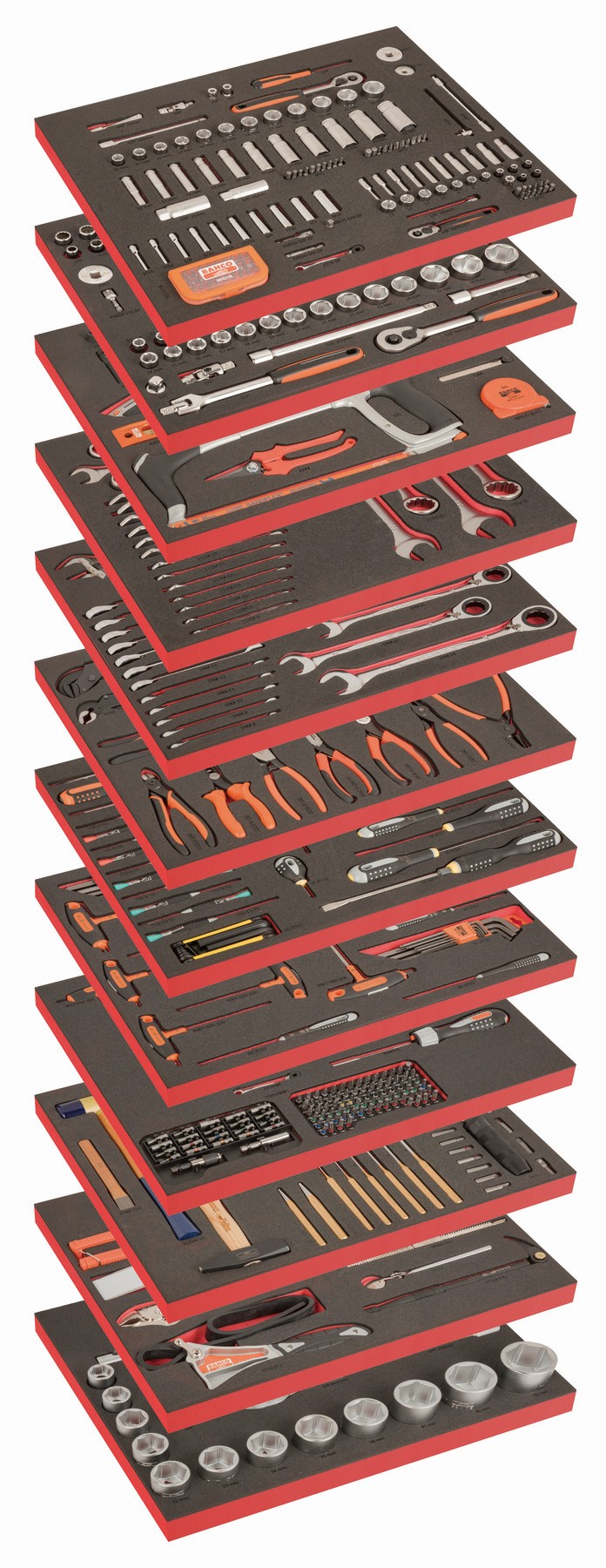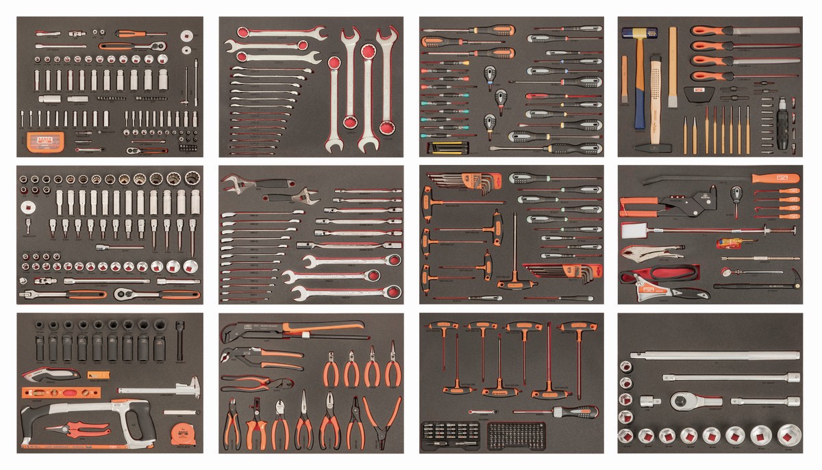 Esta composición grande incluye llaves, alicates, destornilladores, herramientas de golpeo y corte, juegos de vasos, carracas, etc.