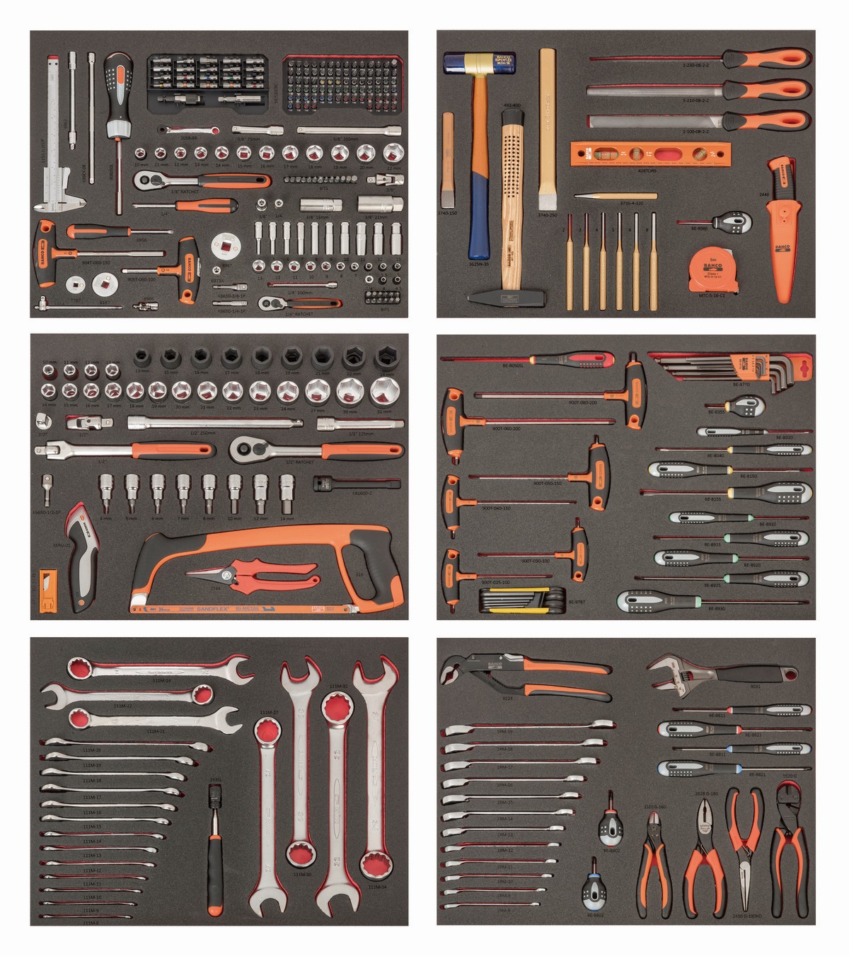 Esta gran composición incluye llaves, vasos, limas, juegos de puntas, herramientas de golpeo y corte, etc.