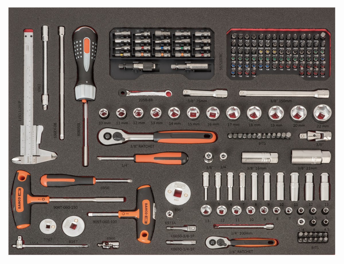 Juego de vasos, destornilladores mango en T, calibre y puntas en bandeja de foam 3/3 Fit&Go con marcado láser (192 piezas) | FF1A207LM de BAHCO