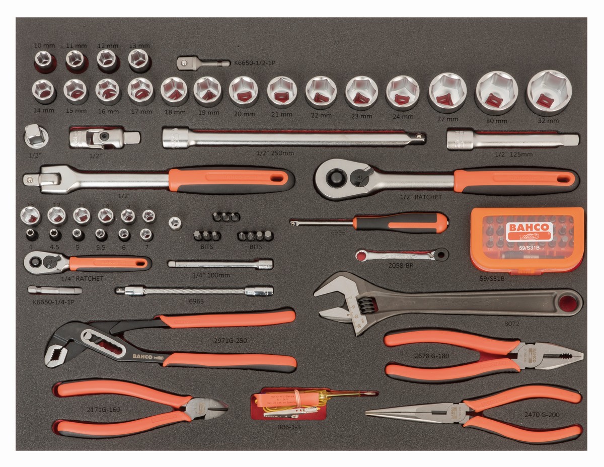 Juego de vasos de 1/4" y 1/2", alicates y puntas en bandeja de foam 3/3 Fit&Go con marcado láser (91 piezas) | FF1A214LM de BAHCO