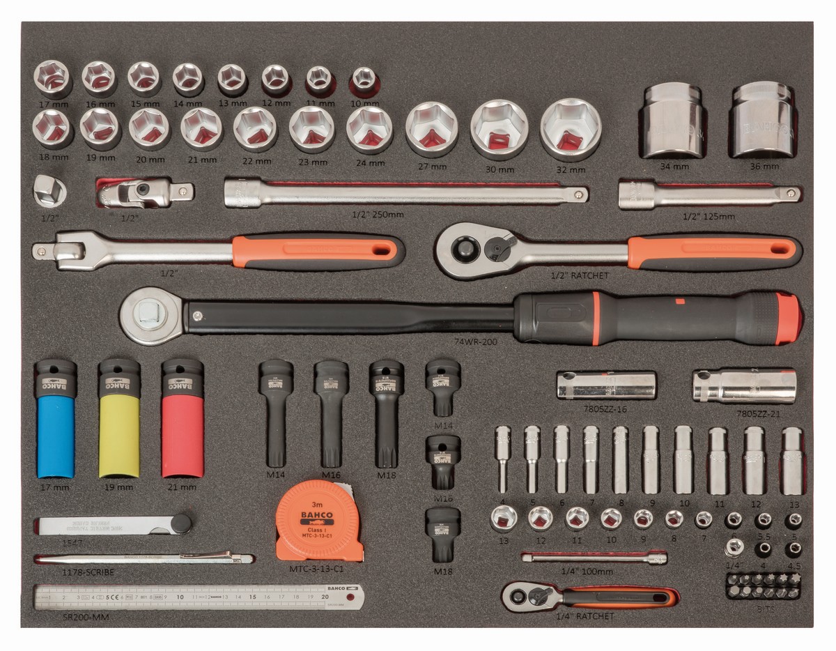 Juego de llave dinamométrica de disparo con visor, vasos para bujías y vasos de 1/4" en bandeja de foam 3/3 Fit&Go con marcado láser (79 piezas) | FF1A218LM de BAHCO