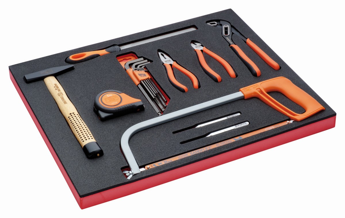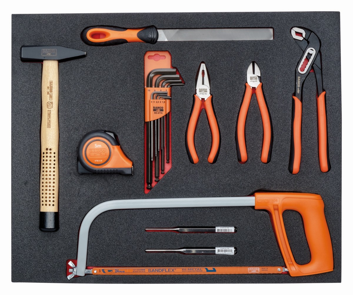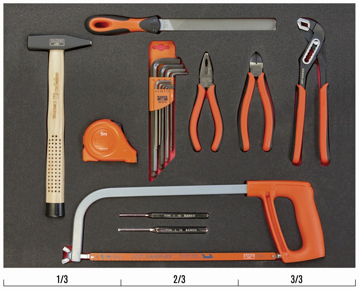 Composición de alicates, herramientas de medición y golpeo en bandeja de foam 3/3 Fit&Go, 18 piezas | FF1A03 de BAHCO