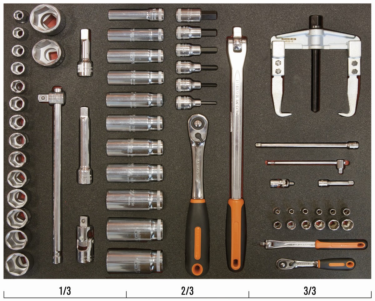 Juego de extractor, carraca de cabeza redonda y vasos en bandeja de foam 3/3 Fit&Go, 58 piezas | FF1A22 de BAHCO