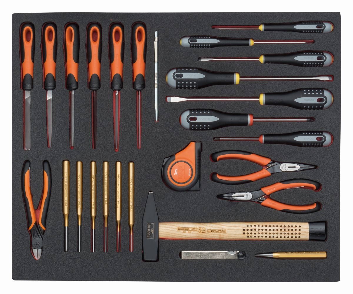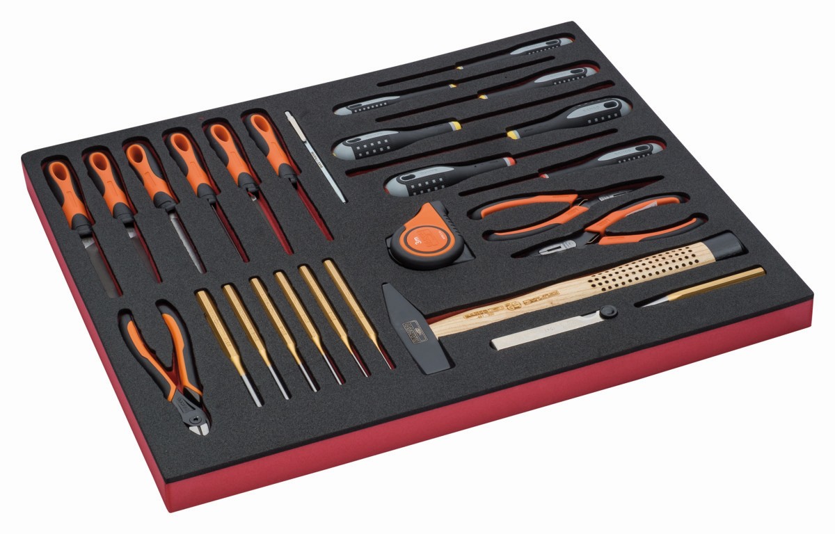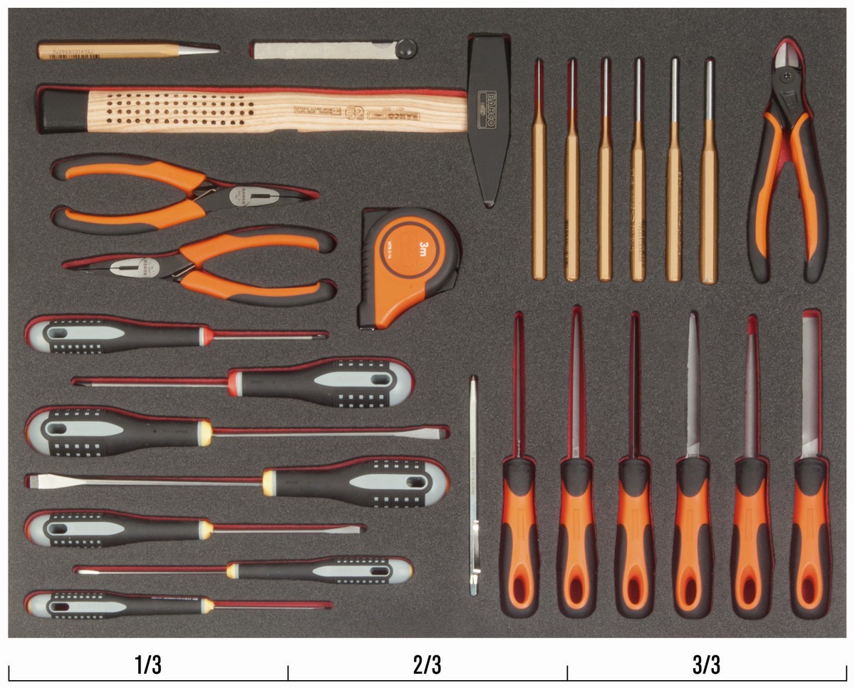 Juego de alicates, herramientas de golpeo, limas y destornilladores en bandeja de foam 3/3 Fit&Go, 27 piezas | FF1A5011 de BAHCO