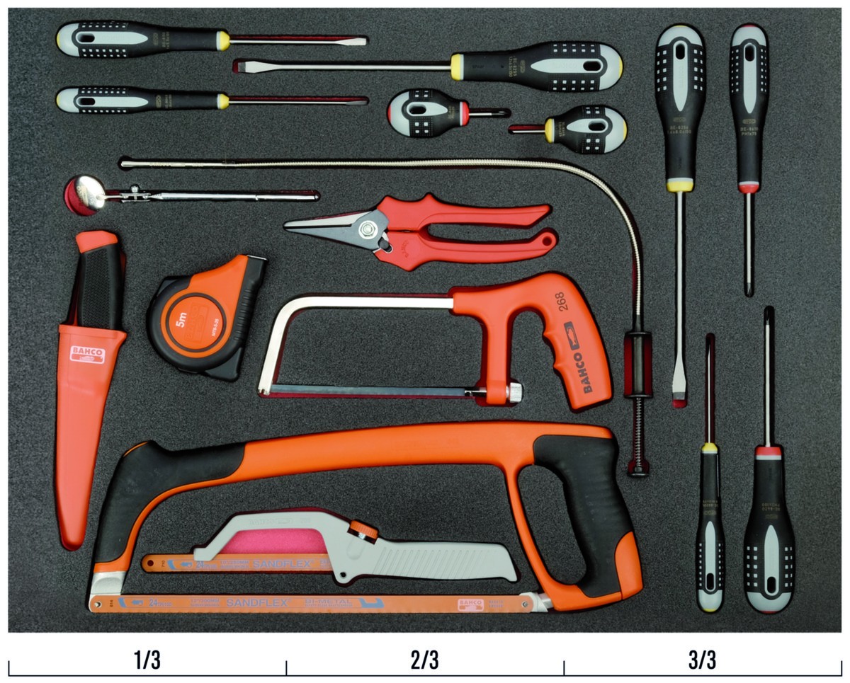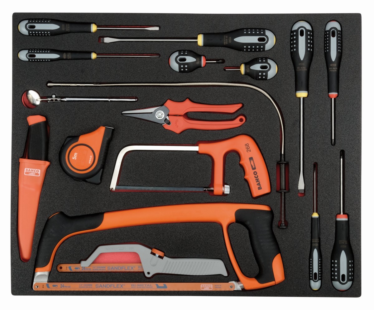 Juego de destornilladores/arco de sierra en bandeja de foam 3/3 Fit&Go, 17 piezas | FF1A5015 de BAHCO