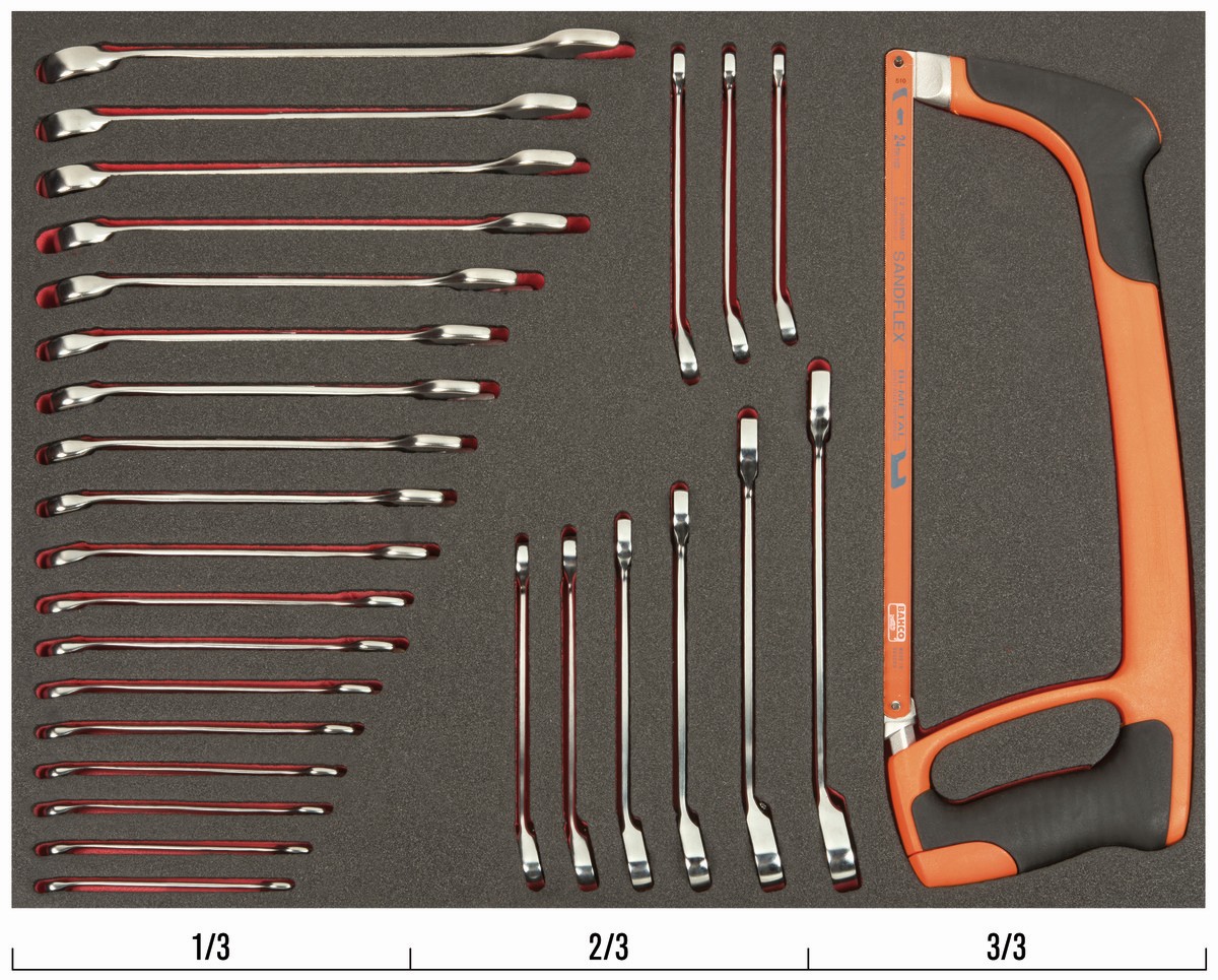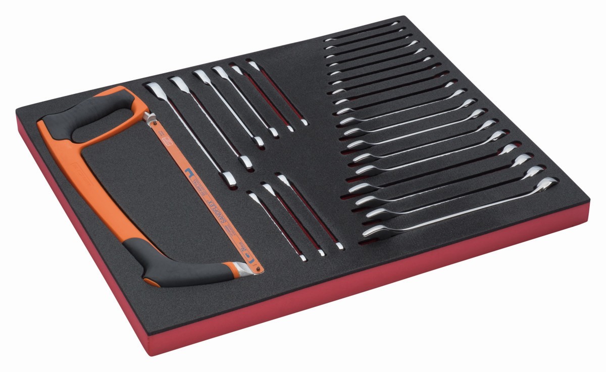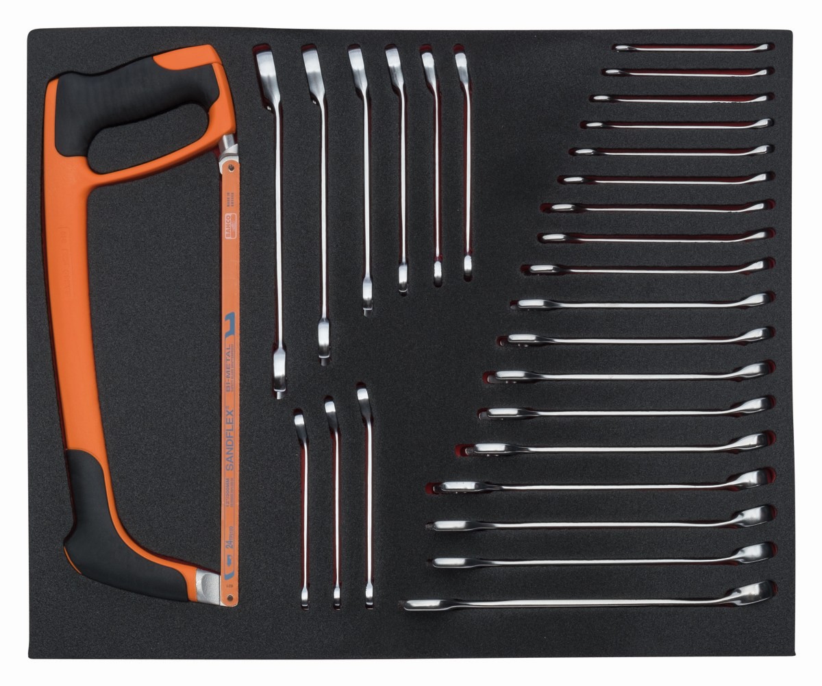 Juego de llaves/arco de sierra en bandeja de foam 3/3 Fit&Go, 28 piezas | FF1A65 de BAHCO