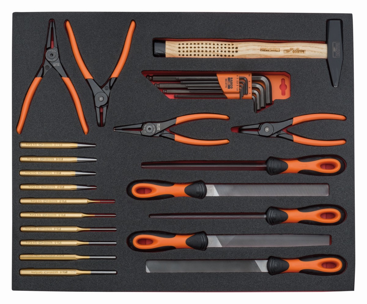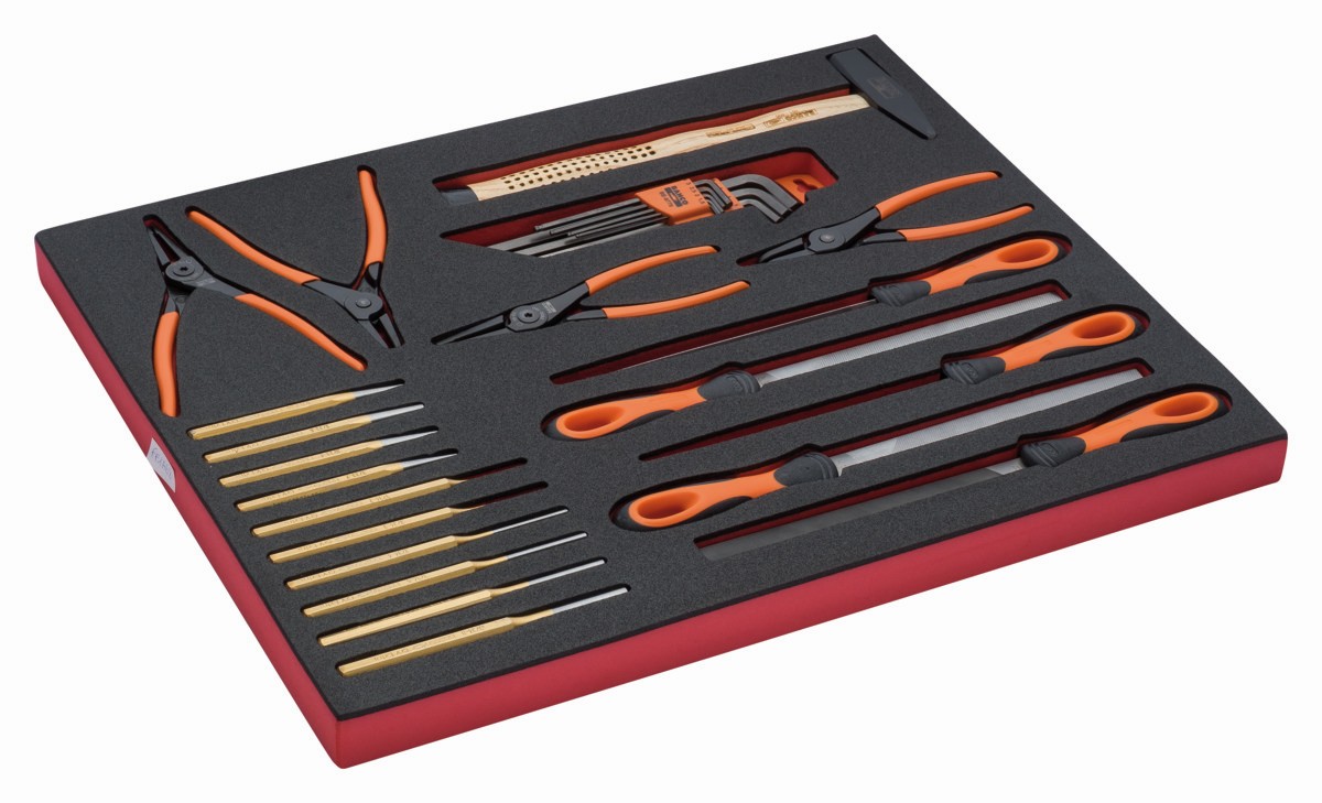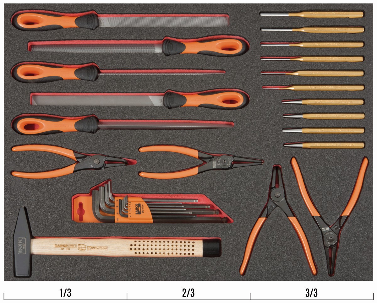 Juego de llaves hexagonales, alicates para arandelas, herramientas de golpeo y limas en bandeja de foam 3/3 Fit&Go (30 piezas) | FF1A68 de BAHCO