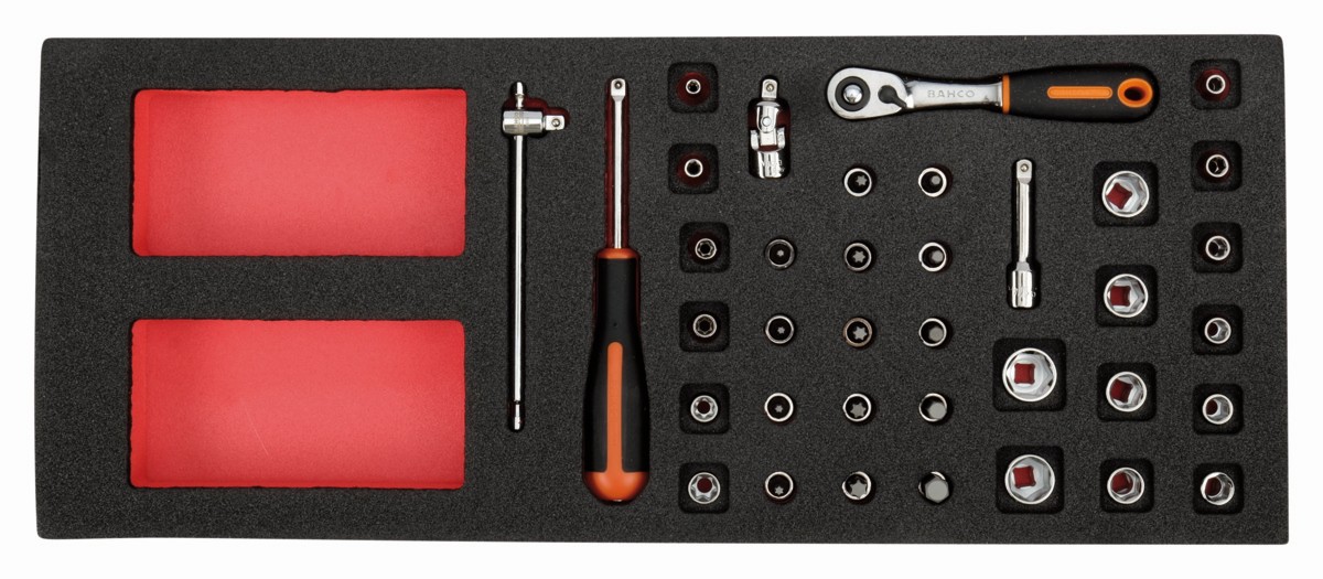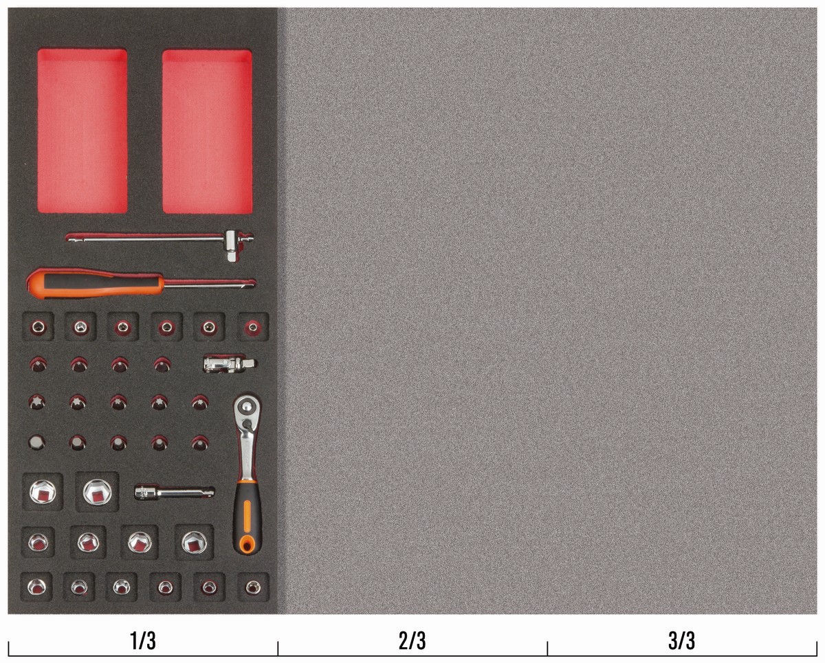 Juego de carraca de cabeza tipo pera y vasos de 1/4" en bandeja de foam 1/3 Fit&Go (37 piezas) | FF1E2001 de BAHCO