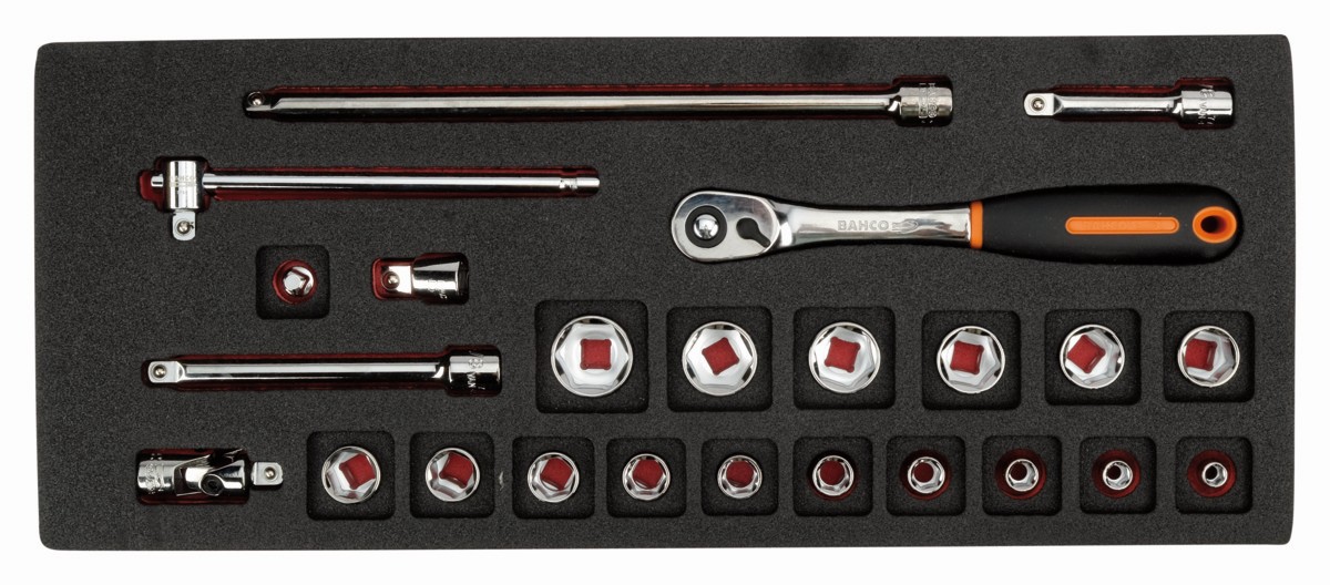 Juego de carraca de cabeza tipo pera y vasos de 3/8" en bandeja de foam 1/3 Fit&Go (24 piezas) | FF1E2101 de BAHCO