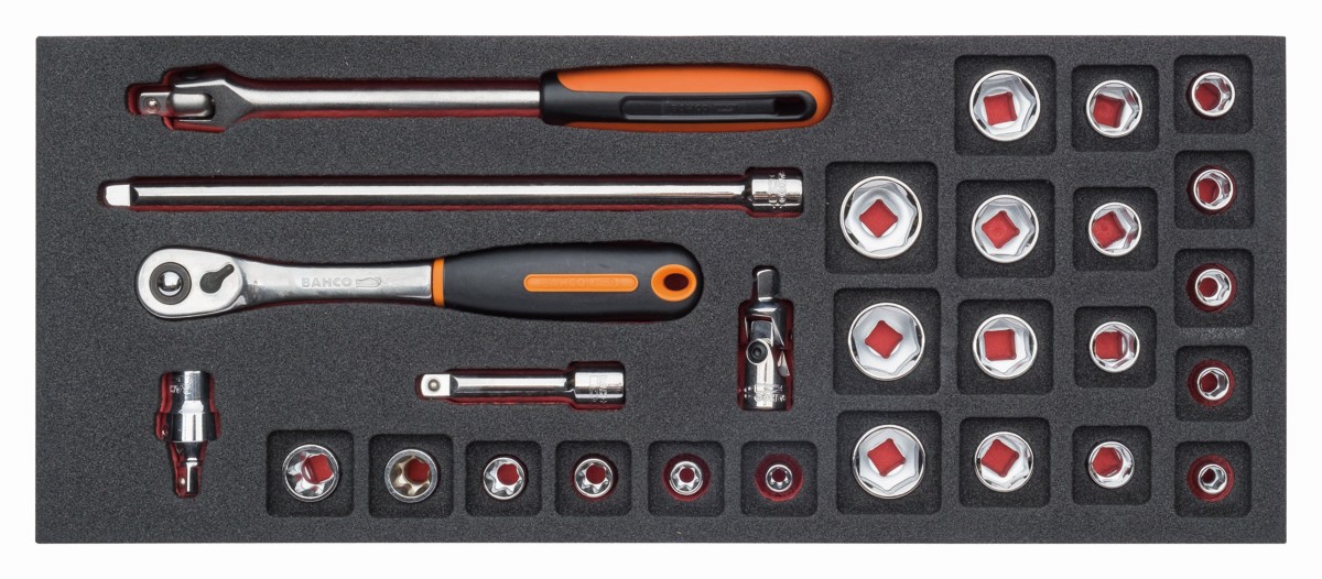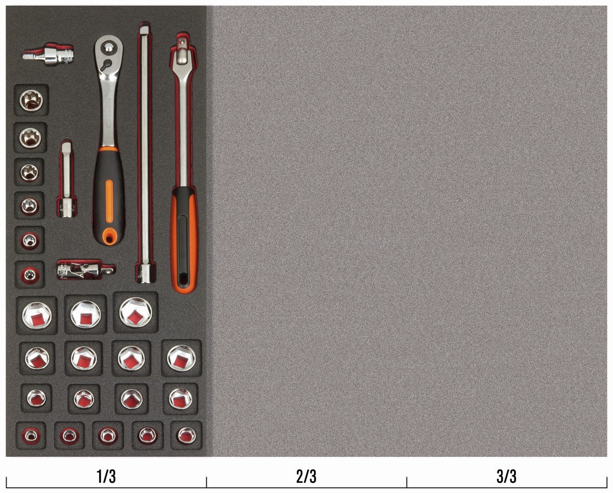 Juego de carraca de cabeza tipo pera y vasos de 3/8" en bandeja de foam 1/3 Fit&Go (28 piezas) | FF1E2103 de BAHCO