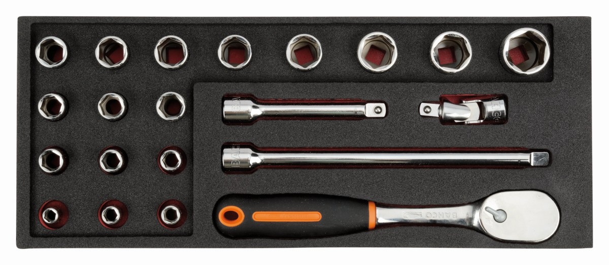 Juego de carraca de cabeza tipo pera y vasos de 1/2" en bandeja de foam 1/3 Fit&Go (21 piezas) | FF1E2202 de BAHCO