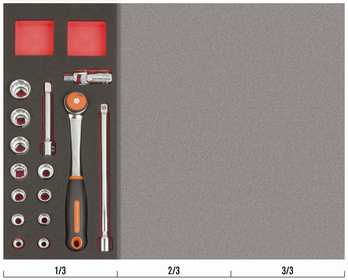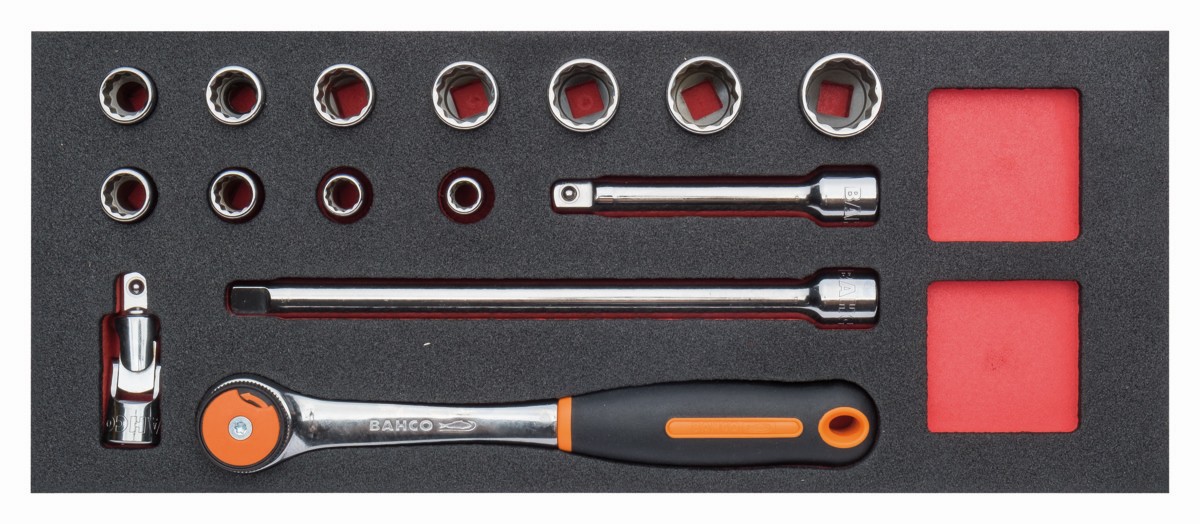Juego de carraca de cabeza redonda y vasos de 1/2" en bandeja de foam 1/3 Fit&Go (15 piezas) | FF1E2204 de BAHCO