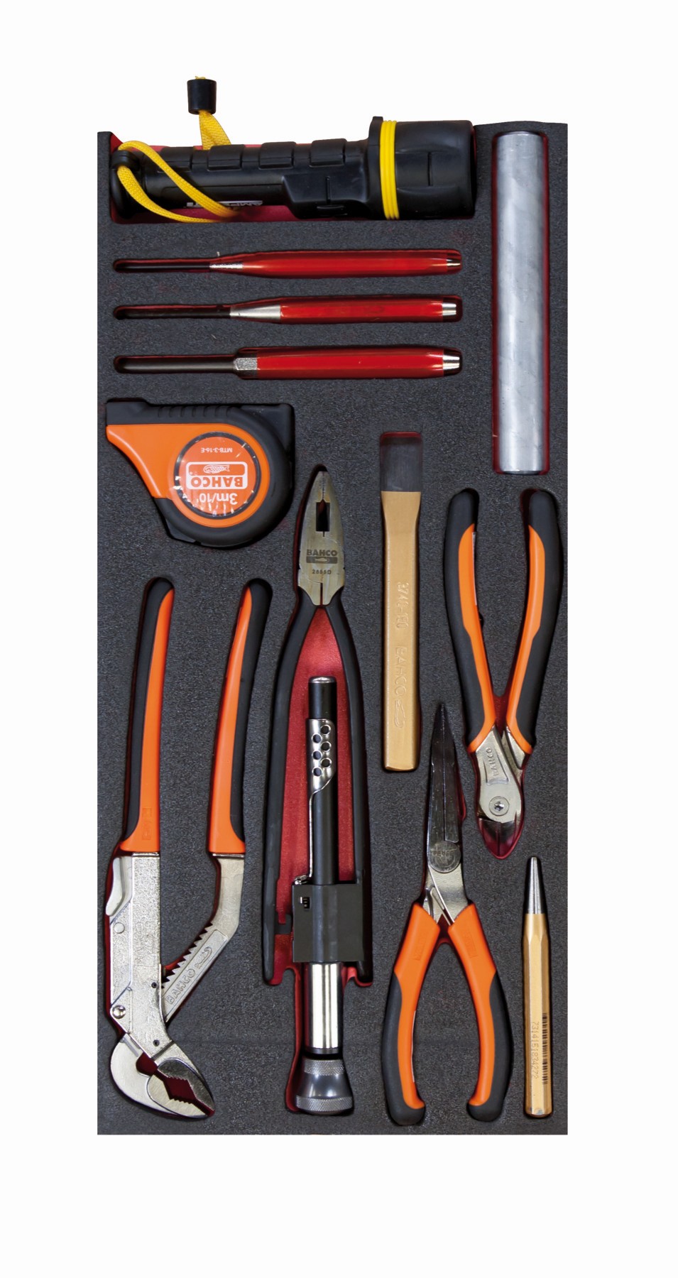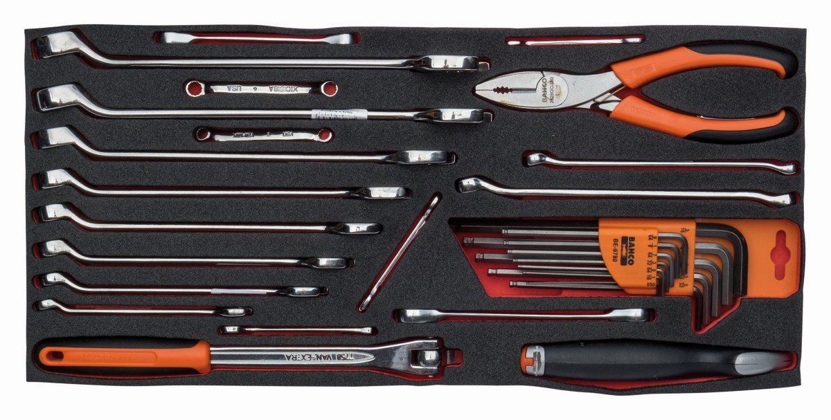 Composición en bandeja de foam para caja metálica de mecánicos de aviación.