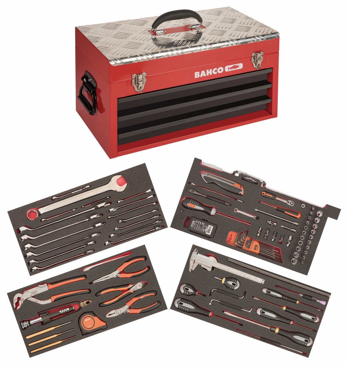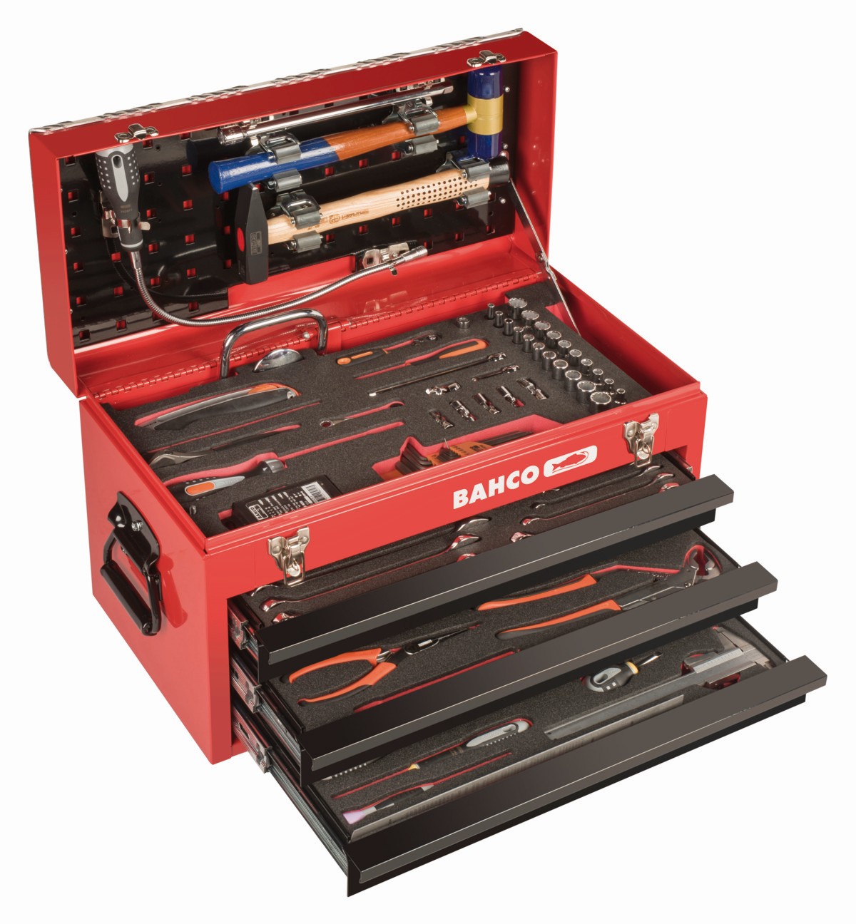 Incluye vasos, llaves, destornilladores, alicates, botadores y herramienta de medición.