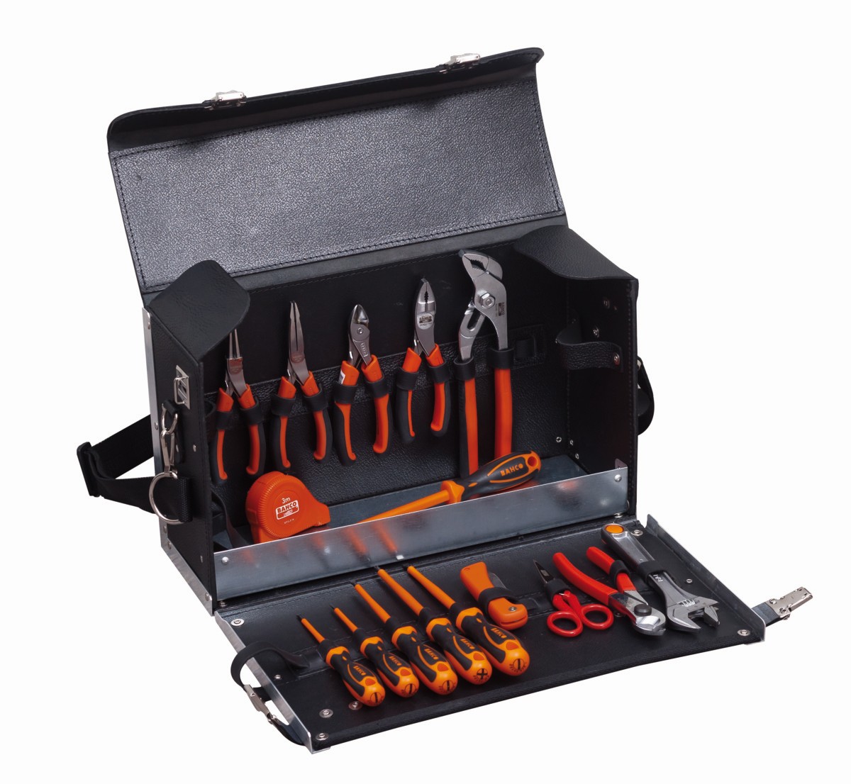 El juego incluye 16 piezas de herramientas para electricistas en una bolsa de cuero