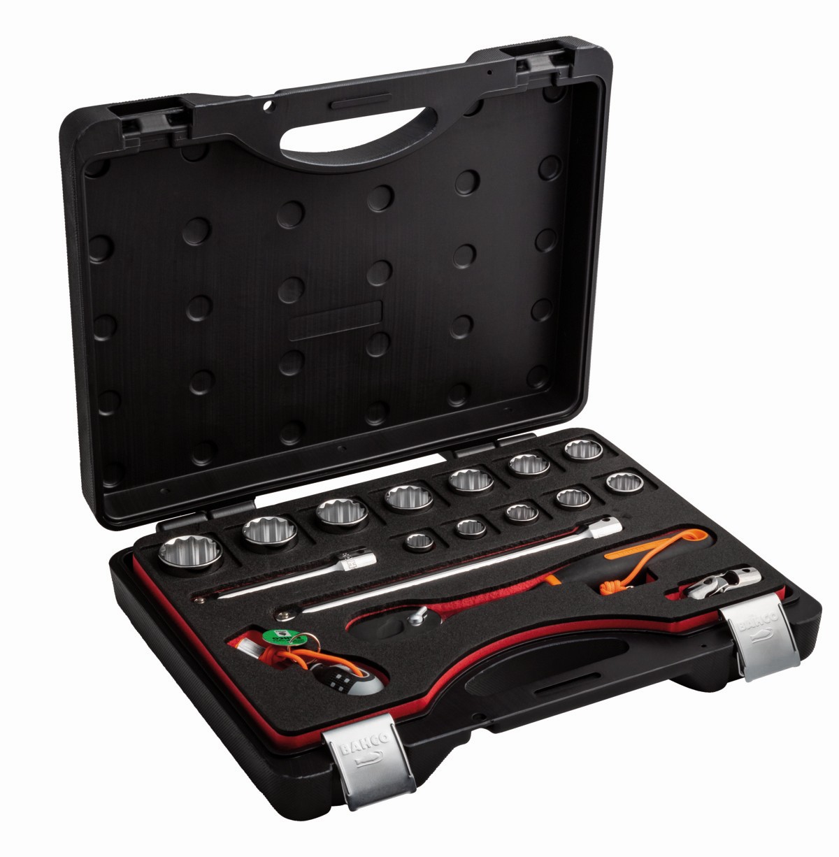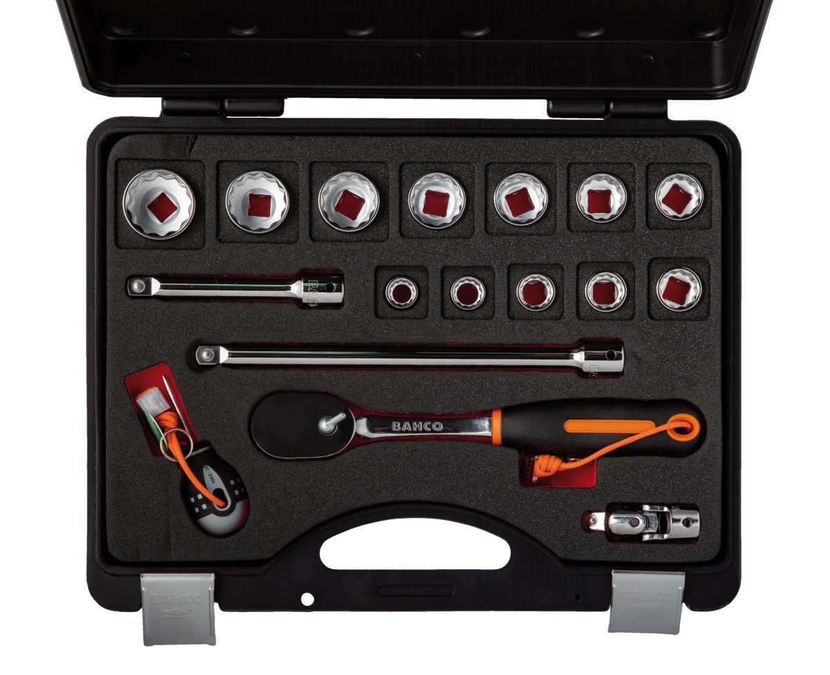 Vasos de ½” de longitud estándar, de ½” to 1.1/4”, carraca reversible de ½” con cabeza tipo pera, alargaderas de ½”, articulación universal de ½” y liberador de pin de seguridad, para trabajos en altura.