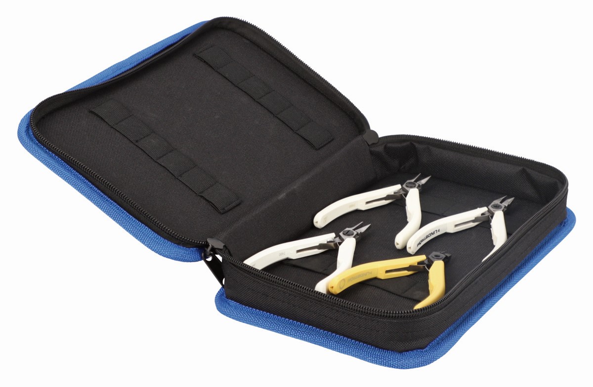 Incluye un alicate para corte al ras y 3 alicates de manipulación: boca redonda, plana y de punta semirredonda
