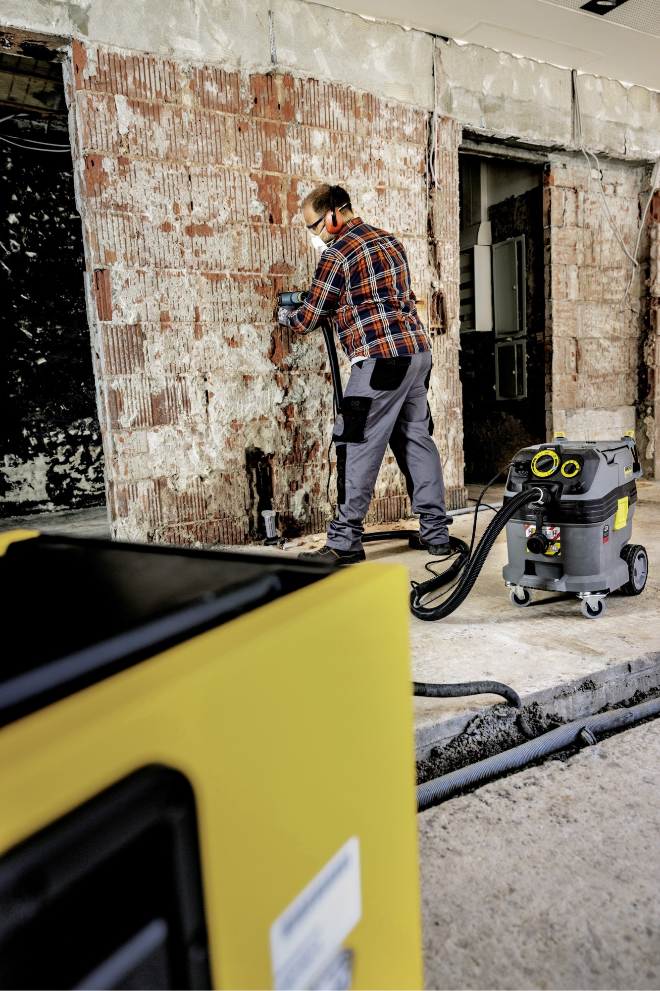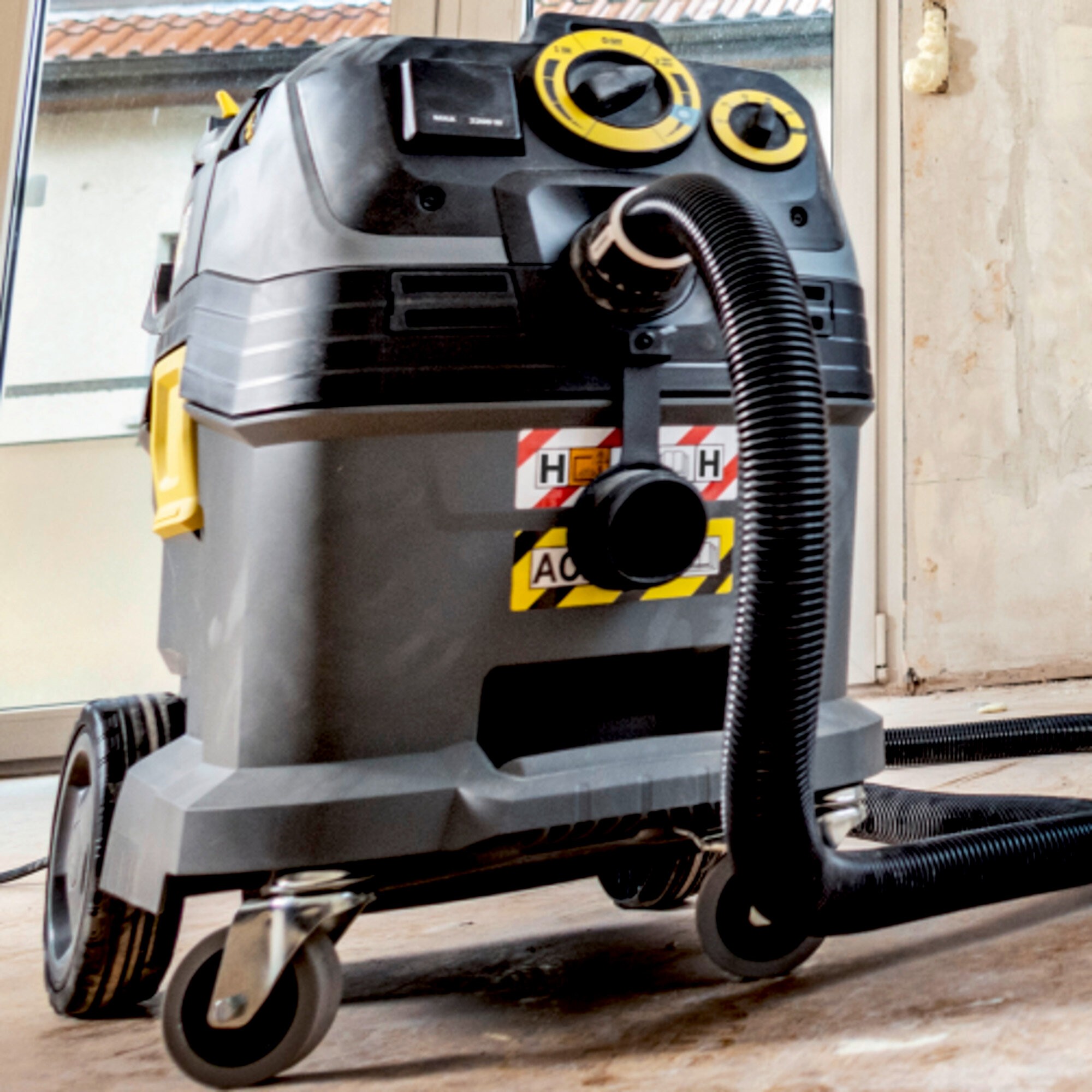 En los trabajos de retirada de amianto en construcciones antiguas, con frecuencia se desprenden amianto y otras sustancias cancerígenas y nocivas para la salud que deben eliminarse de inmediato. Por este motivo, el NT 30/1 Tact Te H ACD es el aspirador en seco y húmedo adecuado. Se ha homologado y está aprobado de acuerdo con la nueva norma ACD (Appliance for the Pickup of Combustible Dust) conforme a la norma IEC 60335-2-69:2021 para la aspiración de polvos combustibles y para todos los polvos de categoría H. Gracias a su diseño móvil y compacto, es idóneo para cambiar de ubicación de uso. Con el filtro plegado plano lavable Safety/HEPA pueden capturarse de forma segura los polvos peligrosos con la bolsa de filtro de seguridad o la bolsa colectora de PE; las grandes cantidades de polvos menos peligrosos pueden aspirarse directamente en el depósito. El sistema de limpieza de filtros Tact, controlado por sensores, garantiza una potencia de aspiración elevada y constante gracias a unos filtros siempre impecables. Una toma de corriente con arranque automático, así como un sistema antiestático con accesorios conductores completan el ingenioso concepto del NT 30/1 Tact Te H ACD.ue automático y el diseño completamente antiestático con accesorios conductores completan el minucioso diseño de nuestro NT 30/1 Tact Te H.