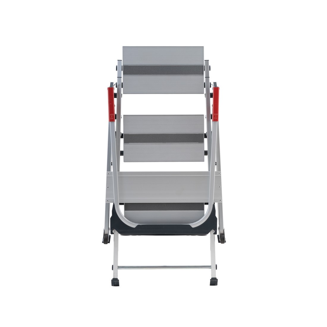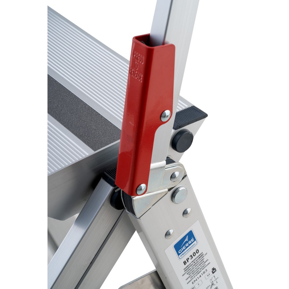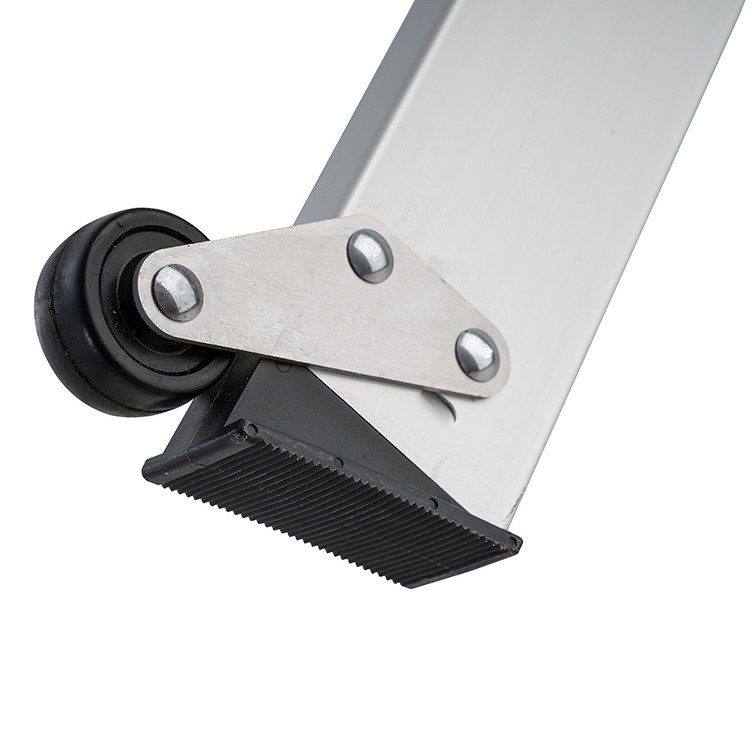 El diseño con doble montante incrementa la estabilidad estructural del conjunto, permitiendo una mayor rigidez durante el uso. Los peldaños anchos incorporan bandas antideslizantes que mejoran la seguridad del operario durante el acceso y permanencia en la plataforma.